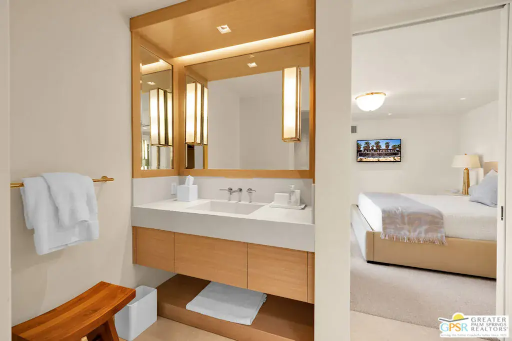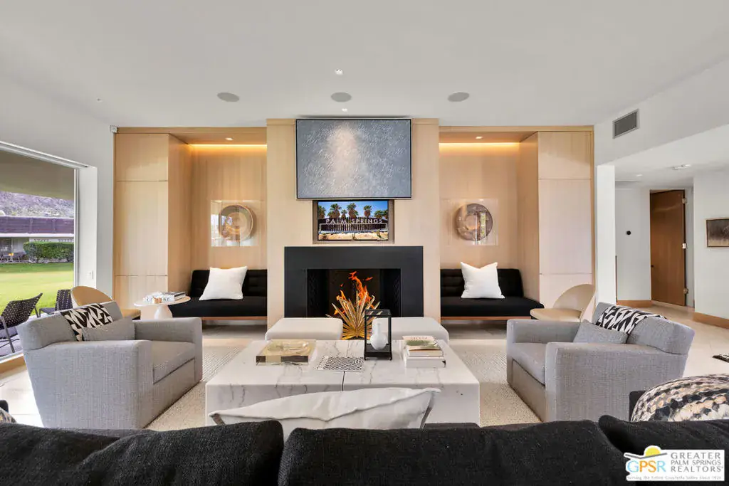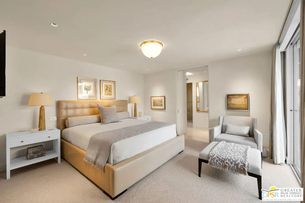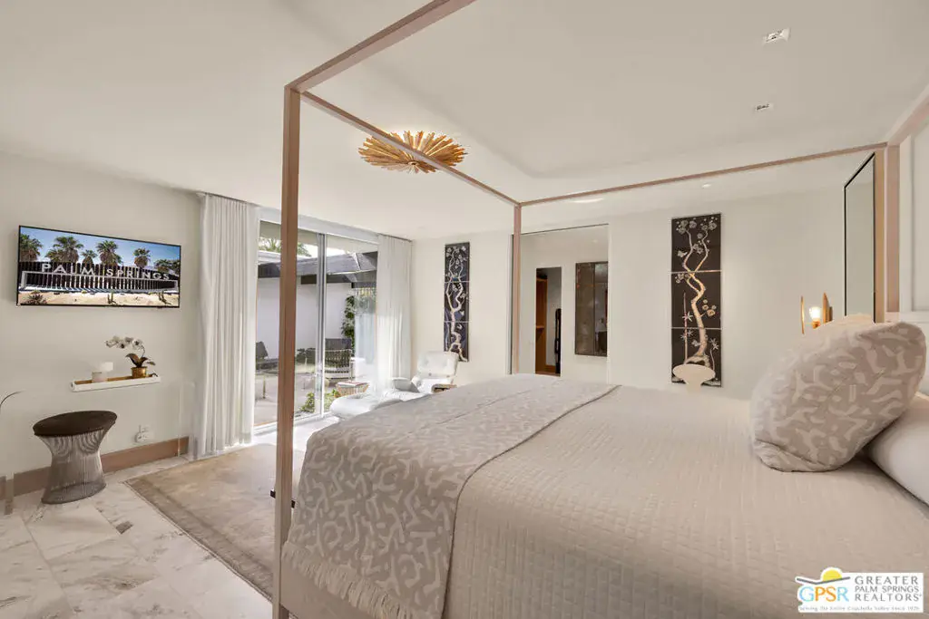 This exceptional residence is located in Marabella Estates in South Palm Springs. Built in 1971, the home exemplifies the mastery of Hollywood Regency style that meets Mid-Century Modern design. Spanning over 2,400 square feet, the home features three spacious bedrooms and dramatic floor-to-ceiling glass walls that open to expansive patios and private courtyard spaces. Thermal-pane anodized windows and sliding doors enhance comfort while framing stunning mountain views. The private courtyard connects two bedrooms and the main living area, creating an ideal setting for entertaining or enjoying a quiet morning coffee. The primary bath is a luxurious retreat, featuring a fully clad Calcutta Umber marble toilet and shower room. The vanity area includes electric heated floors, Calcutta Umber marble flooring, slab countertops with custom stone sinks, and custom bleached oak vanities and soffits. The closet and storage feature matching melamine shelving. Fixtures include Newport Brass hardware, a Kohler toilet with Toto bidet seat, Visual Comfort decorative lighting, and a Euro-style glass shower enclosure. Guest baths are equally refined, with fully clad Crema Vaccione limestone toilet and shower rooms. The vanity areas feature electric heated limestone floors, quartz countertops with custom quartz sinks, custom bleached oak vanities and soffits, matching melamine closets, Newport Brass hardware, Kohler toilets with Toto bidet seats, Visual Comfort lighting, and Euro-style glass shower enclosures. The home has been fully updated with new electrical and plumbing throughout. The reconfigured kitchen opens seamlessly to the great room and showcases custom bleached white oak cabinetry. Top-of-the-line Thermador appliances include a refrigerator/freezer combination, two dishwashers, microwave, refrigerator drawers, and a professional range with a 48-inch gas cooktop featuring six burners and a griddle. The range includes a large oven, a steam/convection/standard oven, and a warming drawer. All countertops and backsplashes are crafted from Taj Mahal quartzite. There are two washing machines and dryers in the indoor laundry room. This spectacular home is being sold with all furnishings, artwork and accessories. Additional upgrades include two HVAC systems installed in 2021, a urethane foam roof with a 10-year warranty installed in 2022, and a new garage roof replaced in 2025. Please see complete list of upgrades in the doc section.
