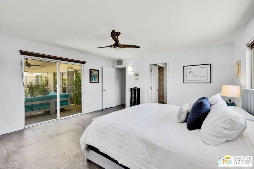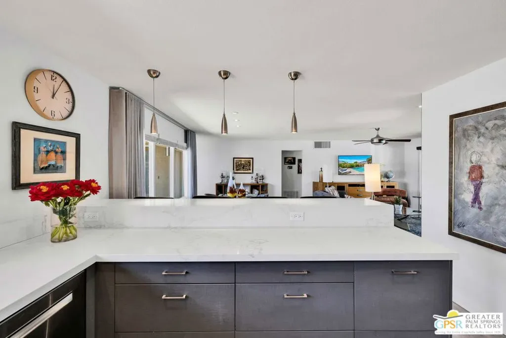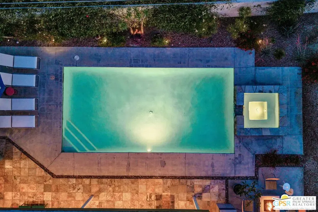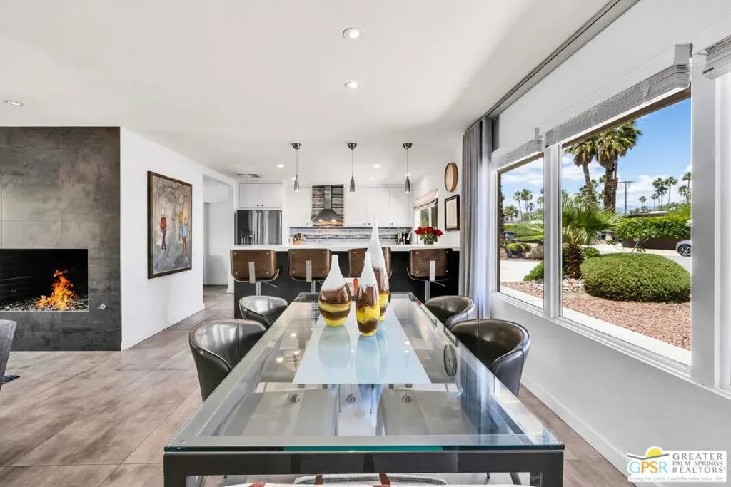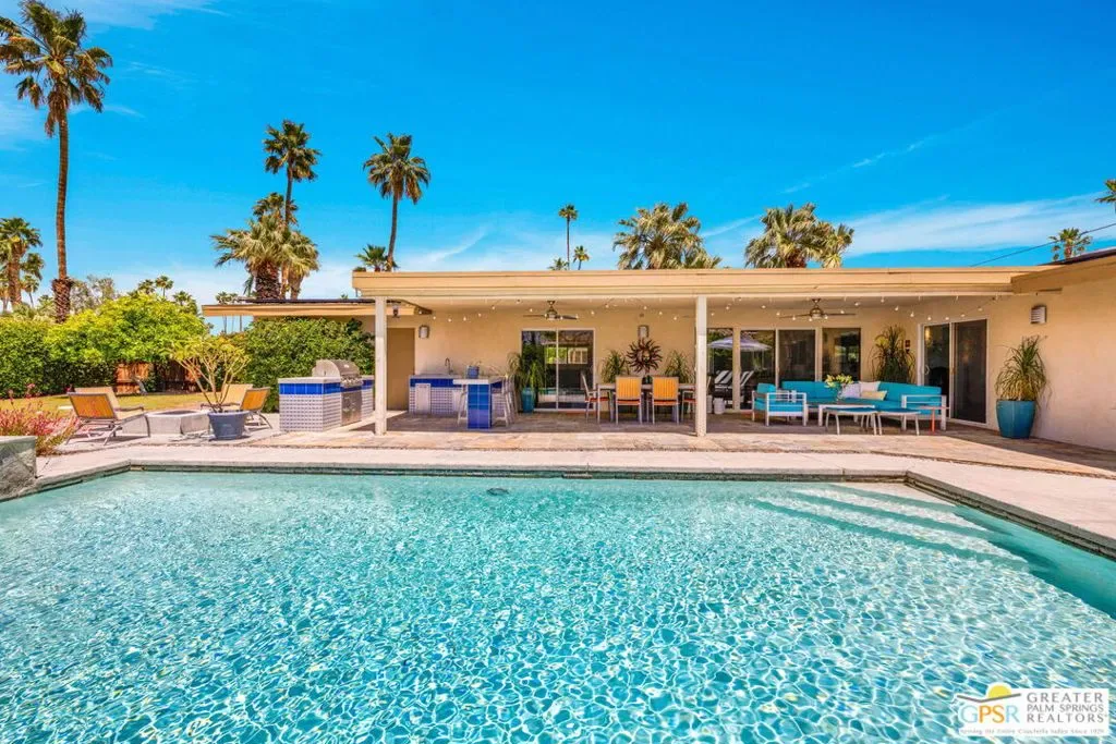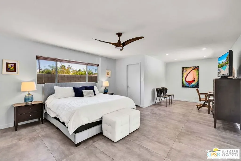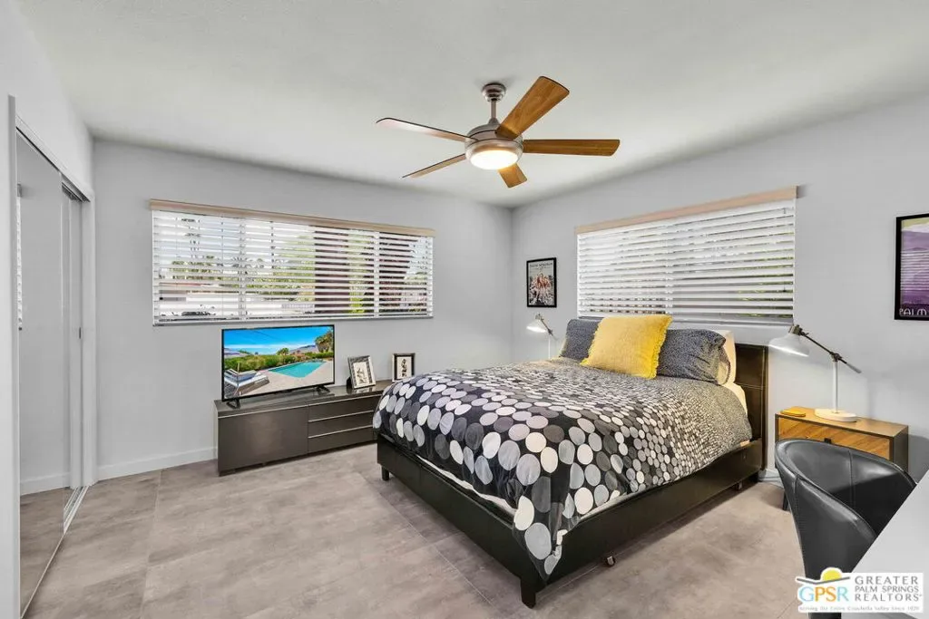 Set in the heart of Palm Springs’ Movie Colony East, this updated desert home delivers the lifestyle buyers want with the value they’ve been waiting for. Positioned on an expansive 10,000+ sq. ft. lot, the property offers rare space, privacy, and meaningful potential for future expansion – an increasingly scarce combination in this coveted neighborhood. The 2-bedroom, 2-bath residence spans 1,630 sq. ft., designed for seamless indoor-outdoor living. Porcelain tile floors run throughout the main spaces, complemented by travertine finishes in the baths. The kitchen is both functional and refined, featuring quartz countertops, custom cabinetry, and Bosch and GE Profile appliances; ideal for everyday use and entertaining alike. The primary suite serves as a private retreat, complete with a walk-in closet and a thoughtfully separated flex space that functions effortlessly as a home office – perfect for remote work or creative use without sacrificing living areas. This adaptable space also lends itself to a fitness zone or quiet lounge. Behind the scenes, smart upgrades include a newer HVAC system (2021), 200-amp electrical panel (2017), 22 owned solar panels (2018), and dual-pane windows and doors; delivering efficiency and peace of mind. Outdoors, the backyard captures the essence of Palm Springs living with a large pool and raised spa, kitchen, lush lawn, and fire pit – all framed by striking San Jacinto Mountain views. Included plans for an approximately 800 sq. ft. expansion further elevate the opportunity, adding a family room, bar, dining area, laundry, 3/4 bath, and an attached studio casita – enhancing both livability and long-term value. Move-in ready with scale, flexibility, and upside, this is a property that truly aligns location, lifestyle, and investment potential.