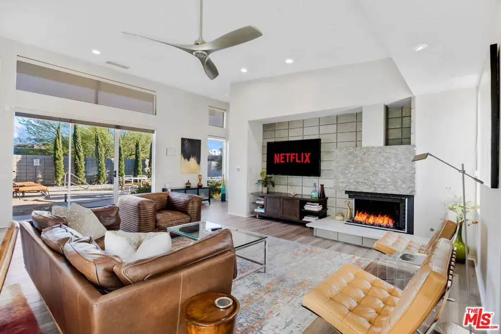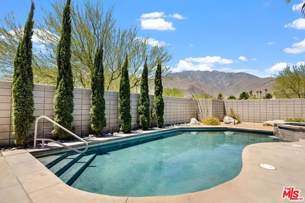 Welcome home to modern desert living at its finest. This stunning Cipriano model home sits in the highly coveted Murano community of Palm Springs, a neighborhood known for its clean lines, mountain views, and timeless mid-century style. Designed by Jim Chioffi, this residence blends architectural beauty with effortless comfort, offering the best of both worlds: classic Palm Springs flair and modern-day luxury.Inside, natural light pours through 8′ sliding glass doors and clerestory windows, illuminating polished concrete floors, stainless steel appliances, and sleek quartz countertops. The open layout is perfect for both relaxing and entertaining, with a custom fireplace anchoring the main living space in warmth and sophistication. Each of the two primary suites feels like a private retreat, complete with walk-in showers and thoughtful design touches throughout. A third bedroom and flexible den/office, with two twin beds, make it easy to host family and friends. New solar. Step outside and discover your own desert oasis: a private pool and spa surrounded by a block wall for privacy, framed by the stunning San Jacinto mountain backdrop. Every detail, from the covered walkway entrance to the designer finishes, has been crafted for beauty, comfort, and ease of living. Whether you’re searching for your full-time sanctuary, a stylish second home, 1090 Azure Ct offers that rare combination of design, location, and lifestyle that defines the true Palm Springs experience.