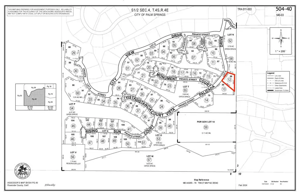 Perched in the prestigious gated community of Desert Palisades, The Flume House (Lot 68) presents a rare opportunity to build your dream home in one of Palm Springs’ most architecturally significant enclaves. This .41-acre homesite offers panoramic, unobstructed southwest views capturing dramatic sunsets, rugged mountain silhouettes, and twinkling city lights below. The property has architectural designs and survey work available, saving you time and expense in the pre-construction process. Set amidst modernist masterpieces, this homesite is ideal for those who value both privacy and visual inspiration. With its elevated position and natural desert terrain, The Flume House is ready to accommodate a striking custom residence that blends seamlessly into its surroundings. Along the vivid, sun-drenched hillsides of Chino Canyon, Desert Palisades is artfully crafting the next chapter in the story of Palm Springs, melding its rich, unmistakable architectural heritage with extraordinary, forward-thinking design vision. Just minutes from downtown Palm Springs, Desert Palisades is where bold architecture meets raw desert beauty–offering a secure, serene lifestyle in a timeless setting.