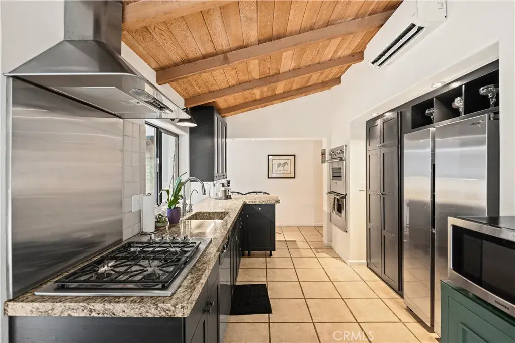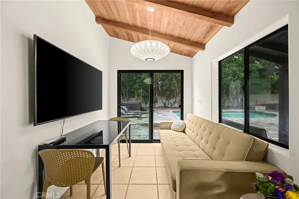 The main residence blends original post-and-beam architecture with a thoughtful modern renovation, featuring a gourmet kitchen with granite countertops, custom lighting, and a seamless flow from indoors to the poolside patio. Designed interiors, tiled showers, thick stone countertops, and custom mirrors bring character and warmth throughout. and a seamless flow from indoors to the poolside patio.
