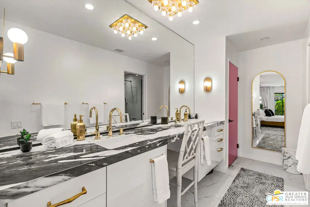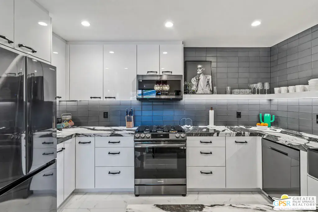 Discover this rarely available 3-bedroom, 2-bath William Cody-inspired end-unit condo nestled in the gated Palm Springs Country Club. Spanning nearly 1,700 sq ft, this glamorous residence feels like a single-family home. The open, light-filled layout boasts large living and dining spaces that flow into lush patios and greenbelts, perfect for modern desert living and entertaining. Significant upgrades completed in 2024 elevate comfort and style. The kitchen is entirely renovated, featuring high-quality appliances, custom cabinetry, designer countertops, and modern lighting, which connects seamlessly to the social areas. Both bathrooms are fully updated and showcase stylish vanities and sleek tile work, with new electronically controlled bidet-like toilets, ensuring a spa-like feel. Throughout this colorful condo, you’ll find new tile flooring and upgraded plumbing fixtures for added convenience and style. Recent enhancements also include a water softener system, washer and dryer ducting with hookups, and security shutters installed on select sliding glass doors. The climate system was fully replaced with a new two-stage HVAC in the attic, all new ducting, vents, fresh insulation, and a smart thermostat for energy efficiency and comfort. All electrical systems have been replaced and upgraded, including the panel, breakers, switches, outlets, and lighting, making everyday living safer and easier. You’re just steps from a sparkling pool and spa surrounded by beautifully maintained landscaping, yet only a short drive from shopping, dining, golf, and downtown Palm Springs. The property sits on fee simple land – no land lease and allows for short term vacation rentals. This cool condo blends iconic mid-century style, substantial upgrades, tranquil views, and a sought-after community setting ready for full-time living, a luxurious second home, or an attractive rental. Schedule your tour today and embrace the best of the Palm Springs resort lifestyle in a home that truly stands out.