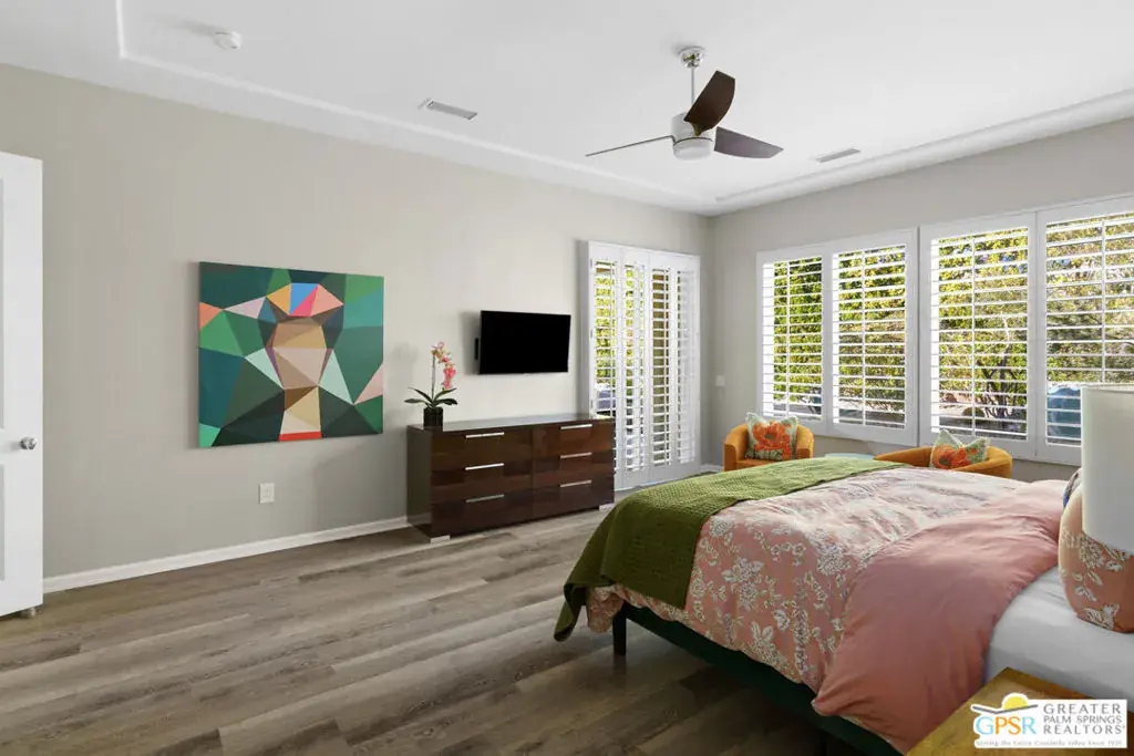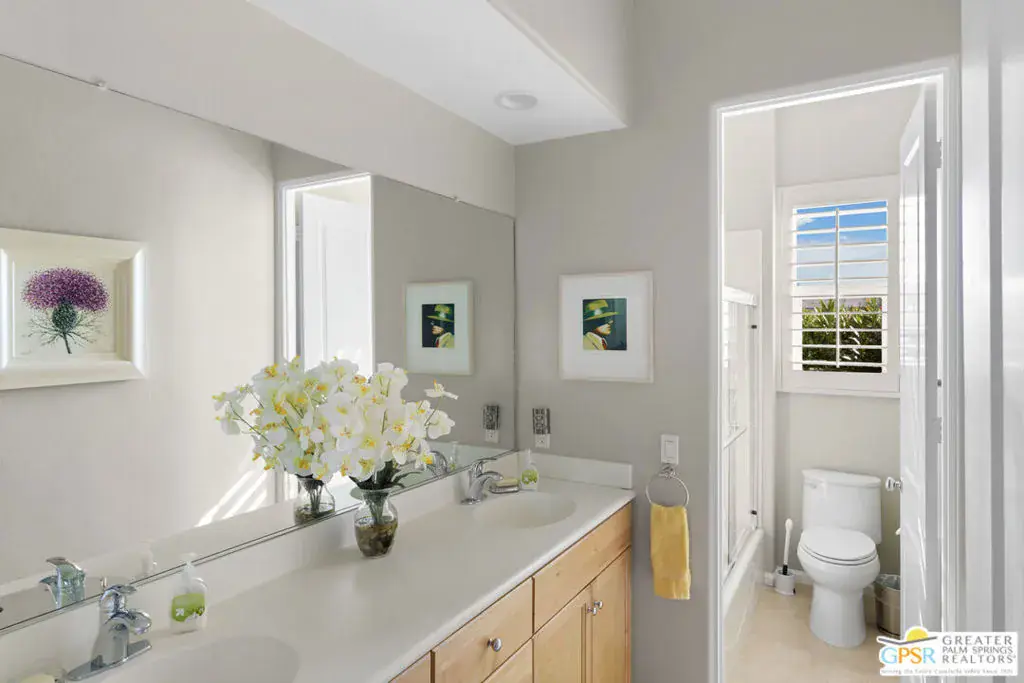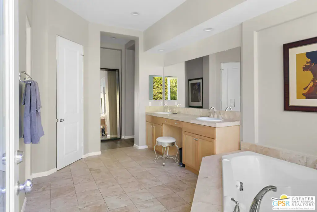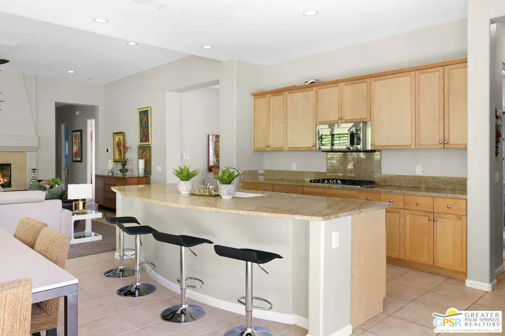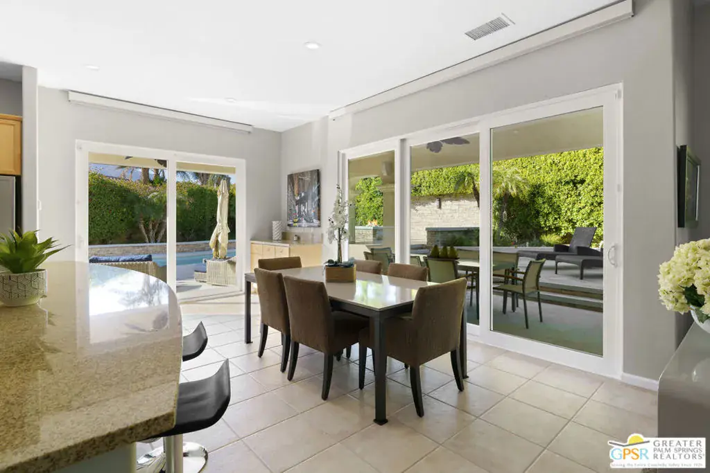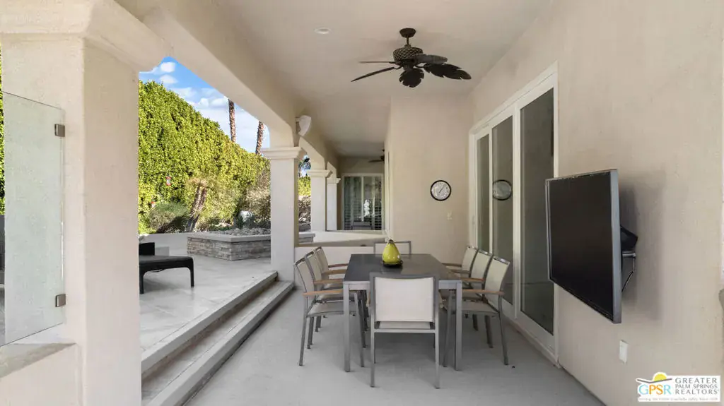 Welcome home – where elegance meets tranquility in this graciously proportioned residence nestled on a peaceful cul-de-sac. With westerly mountain views and a professionally designed backyard oasis, this property offers a lifestyle of luxury and comfort. Experience the heart of the home where the living, kitchen, and dining areas blend seamlessly. This spacious open layout is perfect for entertaining, featuring a large kitchen island that serves as a gathering point for family and friends. Cozy up by the elegant living room fireplace as it creates the perfect ambiance for those cool desert evenings. Step out from the great room onto a wrap-around covered patio, ideal for hosting or enjoying quiet evenings under the stars. The outdoor fireplace and raised sitting areas, complete with a firepit, create an inviting atmosphere for year-round entertaining and relaxation. Dive into your very own pool and spa, nestled within a beautifully landscaped and very private backyard. Pet lovers will appreciate the thoughtfully designed doggie doors leading to two fenced outdoor spaces, providing your furry friends with the freedom to roam. Indulge in the expansive master suite, complete with a spa-like bath with dual vanities, soaking tub, and walk-in shower. Enjoy the convenience of patio access where you can step out to your outdoor shower. The beautifully crafted custom walk-in closet ensures that your wardrobe is impeccably organized and easily accessible. Two additional bedrooms and baths round out the interior along with a TV room/Den. Enjoy the ultimate convenience with a short walk to local groceries, gym, restaurants, and coffee. Whether you are entertaining guests or enjoying quiet family evenings, this home is designed for both relaxation and sophistication.