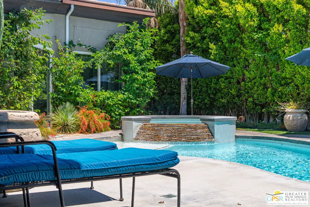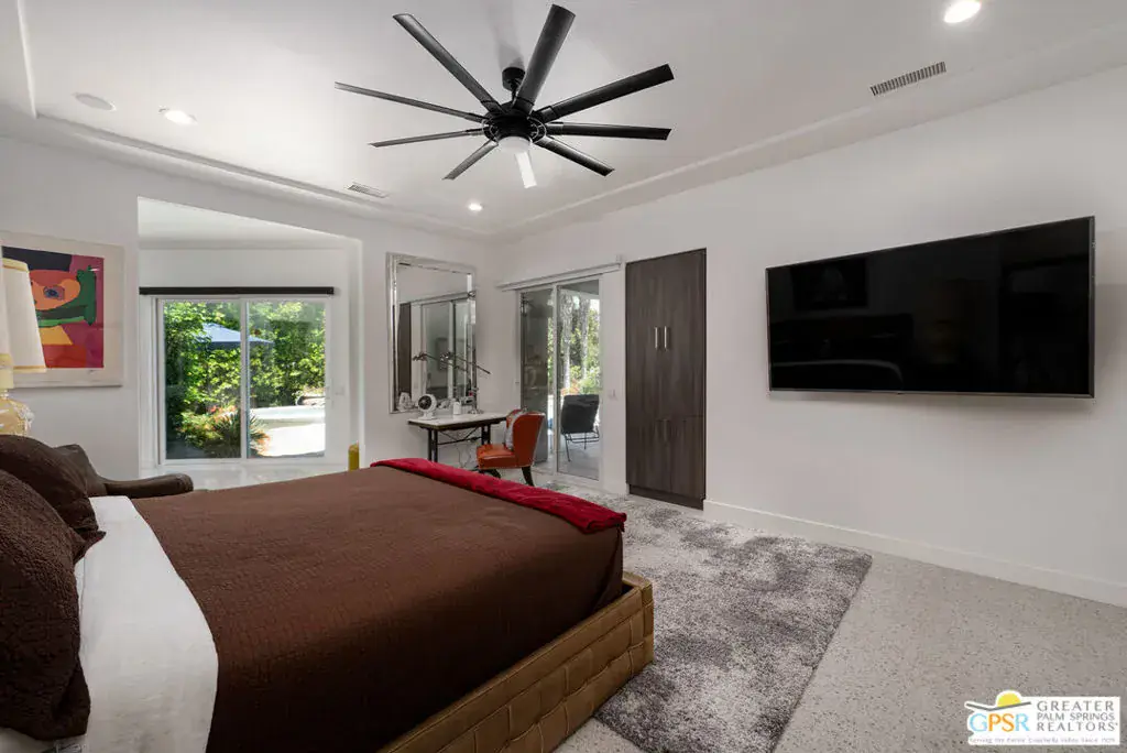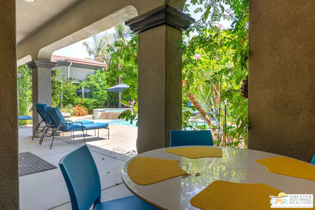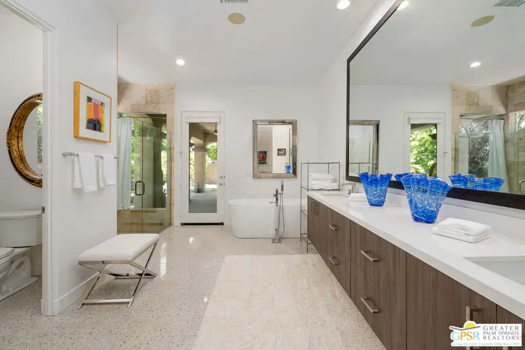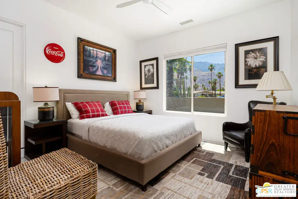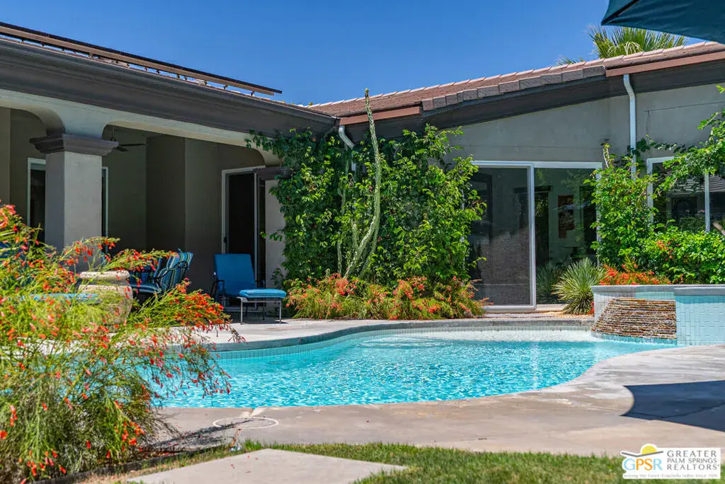 Enormous beautifully renovated 3 bedroom home with separate 1 bed/1 bath GUEST HOUSE in Palm Springs. The Guest House features a separate private walkway, gate and entrance as well as a full kitchen and washer/dryer. Built in 2004, this home has been lovingly maintained and upgraded. The large terrazzo tile flooring extends throughout the entire home. The spacious open floor plan brings the kitchen, living room and dining room together for inclusion for all. This home is spacious and boasts an open kitchen that flows into the great room, which is anchored by a fireplace and tempting views of the private pool/spa area. The large gourmet cook’s kitchen includes an large central island with counter seating, Butler’s pantry/coffee station, dry goods pantry, Bosch appliances, gas cooktop and modern tile backsplash. The primary suite is EXPANSIVE with a full office/private living room/media room attached at the back. With a small change, this room could even be a 5th bedroom or 2nd casita as it has it’s own private entrance. The primary bath includes a stand alone tub, large shower, dual sink floating vanity, appropriately sized expansive mirror, separate water closet and walk-in closet with custom shelving. Two guest suites share the guest bath also with stunning dual sink vanity and matching impressive custom mirror. Views of the pool and spa can be seen from almost every room through dual pane windows and sliding doors. Energy efficiency was well considered with multiple AC zones, enhanced ceiling fans and 42 solar panels. Parking includes an oversized 2-car garage and a driveway with room for 3 cars. Other amenities include water conditioner system, outdoor shower, tankless water heater and a separate laundry room with upper and lower cabinets, sink, counter space and window with a mountain view. THE CASITA has a separate PRIVATE walkway and entrance. Inside, a bedroom, living room, stackable laundry, desk/dining table, kitchen with cabinets, counters, refrigerator, sink and disposal, gas range, oven and microwave. The owners have rented this casita out casually making about $20,000 per year income. Alternatively, live and use the casita while renting out the main house for even greater income. In the back yard, the pool and spa with waterfall takes the main focus. Don’t miss the hardline gas grill, outdoor shower, pet friendly grass areas and entertainment area for outdoor table tennis and games. The versatility of the homes features will make you feel at home immediately upon arrival. On land that you own. No HOA. Solar system includes 42 panels w 13.73kW.