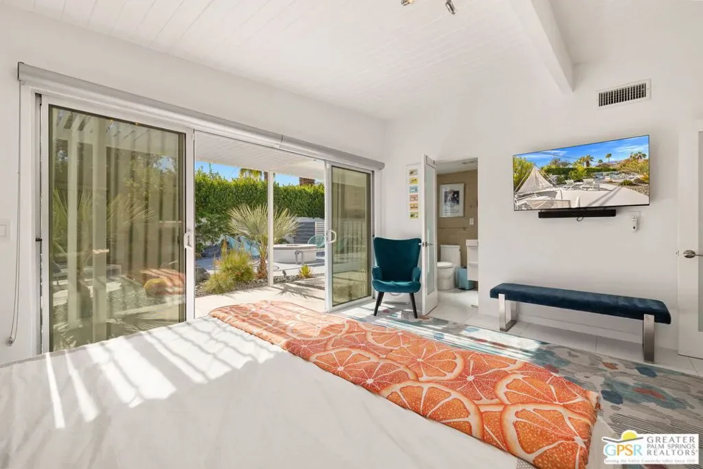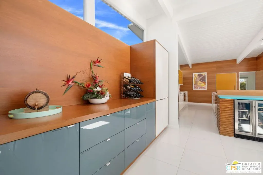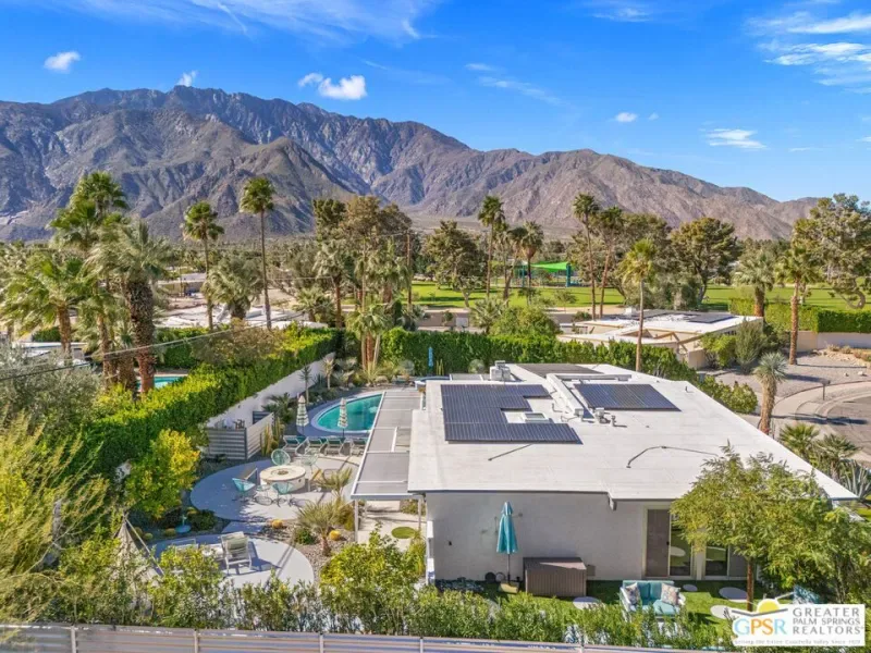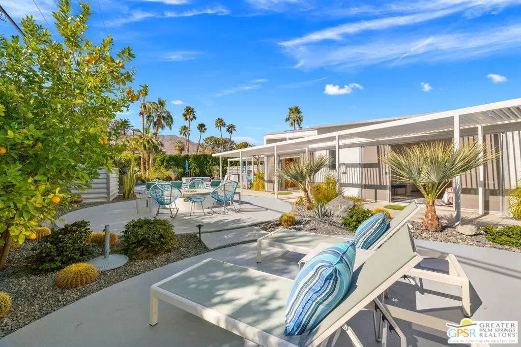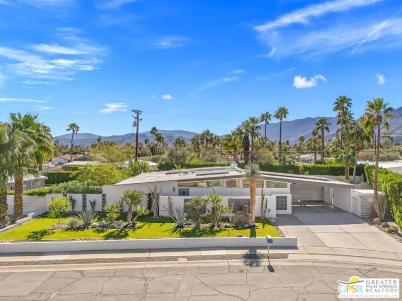 MOTOR UP to the cul-de-sac for a closer look at this iconic 1960 Alexander, quintessential Palm Springs and a darling of the Modernism Tour. A striking breeze block wall fronts the home, making a bold midcentury statement while providing privacy and architectural presence from the street. One of the most coveted rooflines follows with deep overhangs, extra tall ceilings, clerestory windows, and an effortless indoor outdoor flow designed for shade, breezes, and postcard worthy mountain views. Its Garden Road locale is a headline all its own, perfectly positioned within the architecturally significant Racquet Club Estates. The open concept layout spills seamlessly into a resort style backyard that delivers serious wow, ultra private and fully fenced with multiple outdoor entertaining zones anchored by a built in BBQ with bar sink and dry bar, a sparkling saltwater pool and spa with waterfall, a lighted pergola perfect for evening gatherings, gas fire pit, and citrus trees that complete the desert playground. The open kitchen, featuring an island bar with beverage fridge, was built for hosting, while the living room’s gas fireplace adds warmth and style. Bedrooms are thoughtfully separated for privacy with the primary suite opening directly to the pool terrace, while guest bedrooms two and three enjoy access to a spacious private garden retreat. Notable upgrades include OWNED SOLAR by HPE, modernist custom cabinetry in the kitchen and expanded dining area, a newer HVAC system, tankless water heater, and custom window coverings throughout. Located moments from the best of Uptown and Downtown Palm Springs shopping, dining, and entertainment, this home shines as a full time residence, weekend escape, or vacation rental (30+ days). More than almost any other builder, Alexander Homes helped cement Palm Springs as the capital of midcentury modern living, and today these homes are highly collectible, endlessly photographed, and always in demand.