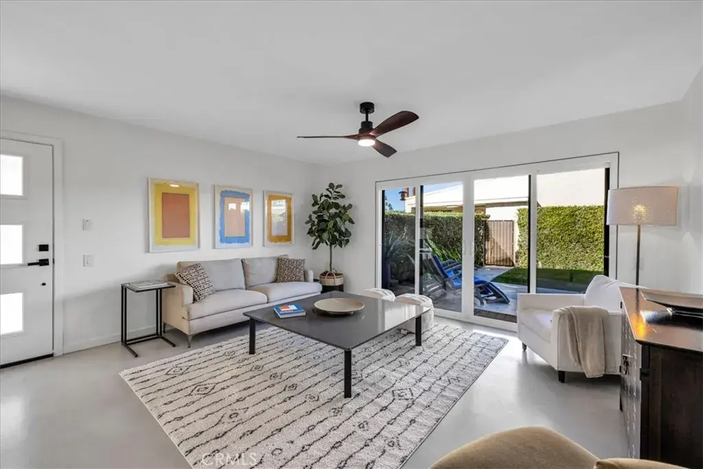 Welcome to Ramona Villas, a gated community designed by renowned architect Richard Harrison. This remodeled, single-level, 2 Bed, 2 Bath end unit is situated on Fee land with only one shared wall, no neighbors above or below, and no steps. The light-filled interior features skylights, New concrete flooring, New dual-pane windows and sliders, an open-concept living area, and upgraded kitchen and baths. The spacious primary suite includes two closets, a remodeled ensuite bath, and direct patio access. A second bedroom is located across from the hall bath. Full-size stacked washer and dryer included. The private north and west facing Private backyard offers two covered patios, a lawn area for pets, mountain views, and the option to fence with HOA approval. A front lawn enhances the single-family-home feel. Ideally located across from the clubhouse, saltwater pool and spa, fitness room, and sauna, and just steps to EV charging stations and tennis court. The end-space covered carport includes built-in storage cabinets plus an additional exterior storage closet. The low HOA covers roof, earthquake insurance, water, trash, and rear-yard maintenance.This secure gated community is just minutes from downtown Palm Springs dining, shopping, and entertainment.