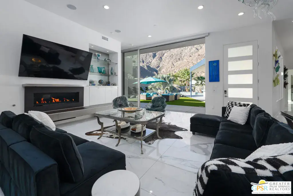HOME + EV CAR Combo! Enjoy this Luxury Modern home in downtown Palm Springs located in the Skye community within the Historic Tennis Club neighborhood with a Model 3 TESLA Included. Built in 2018, this home sits on one of the LARGEST lots with over 16,000 square feet and with over 3400 square feet of living space. This 4 bed and 4.5 bath home provides many areas for relaxation, meditation, entertainment and ease of daily living. Arguably one of the best floor plans, stunning up-close mountain views can be seen from almost the entire home! Oriented strategically, the front western facing pool utilizes the best features of Palm Springs, the Mountain and the Sun! The master bedroom, Living room, Dining Room, kitchen and Media Room all face outdoors. The 12-foot ceilings and 12-foot stack sliders allow the boundaries between indoors and outdoors to merge. The master suite has direct pool and mountain views! Interior and exterior shades provide complete control over privacy and light. The ensuite bath is truly a spa-like experience. Dual water-closets, vanities and sinks allow for complete personalization of one’s “getting ready space”. The large glass-surround shower and extra-deep stand-alone tub offer choice. The master closet is enormous! The gourmet kitchen includes perhaps the largest quartz kitchen island seen, double-ovens, generous preparation space, gas cooktop & hood and large walk-in pantry. The adjacent dining room allows for more formal eating occasions while the bar-counter and outdoor counter provide more intimate and fun settings. The fourth ensuite bedroom can be used as an office, lounge, media room or home gym. Private enjoyment of the outdoors is paramount in Palm Springs. Desert palms, cacti and agaves provide an envious, luxurious curb appeal while offering an intimate, private oasis inside the walls. Beautiful landscaping surrounds the home on all sides. Walk-ways connect multiple seating areas around the entire home. Swim, splash, soak or drift in the pool and spa with complete privacy. The front yard is THE place to be! Facing west, the mountains appear close enough to touch. During the day, lounge half-in and half-out of the water one of the two pool tanning shelves. For evening, the outdoor Barbeque area includes a gas grill, griddle, two preparation sinks, beverage center and large countertop with bar-top seating. Turn on the gas fire pit and enjoy company or solitude while enjoying the night sky or gazing at the mountain. The elevated spa waters trickle down peacefully into the pool adding to the relaxing ambience. Inside the pool, take a break from swimming or just cool off while having a beverage on the six built-in underwater seats. This luxury home also includes a 3-CAR garage, garage AC, hanging garage storage racks, tankless water heater, home automation, electrified blinds, outdoor BBQ area with counter seating, multiple outdoor destination areas and is close to downtown Palm Springs and a few streets away from the north Lykken hiking trail.