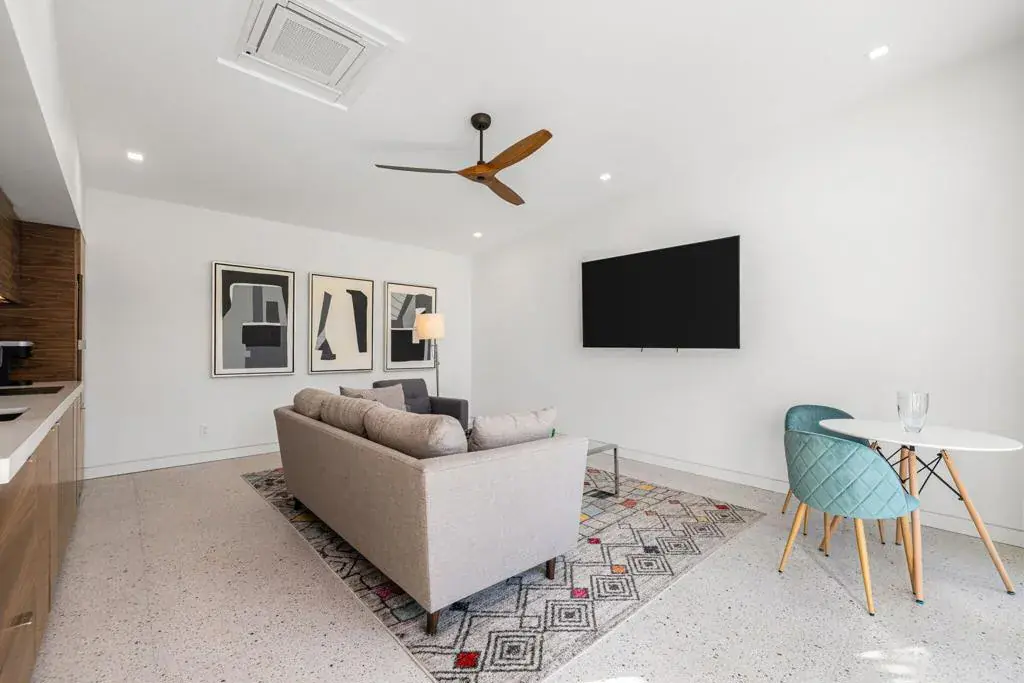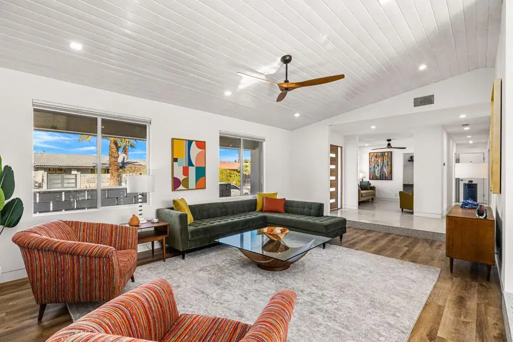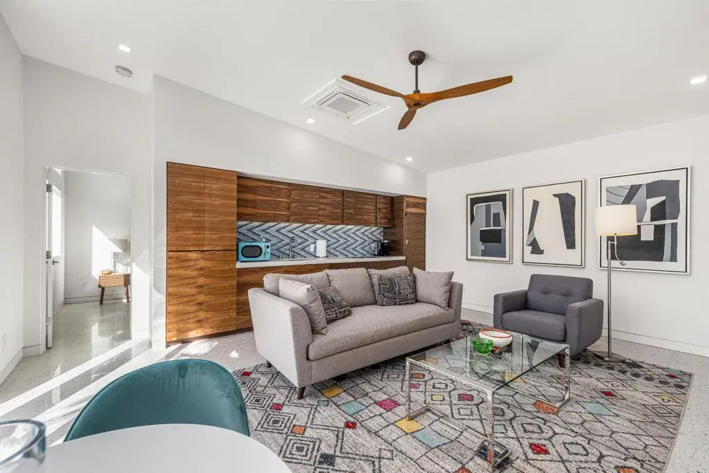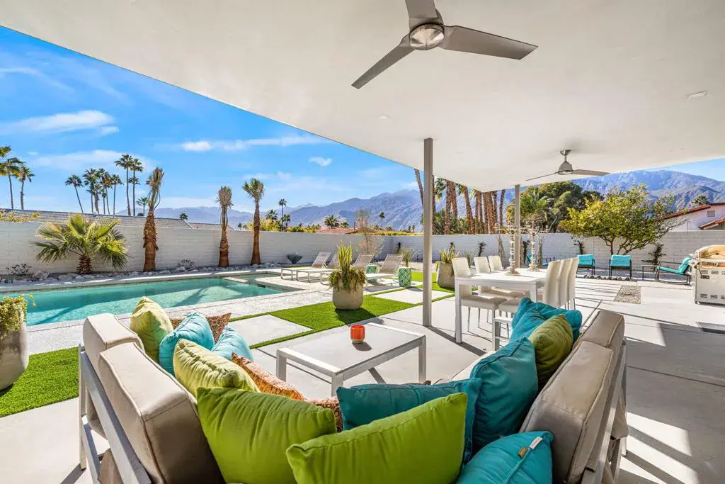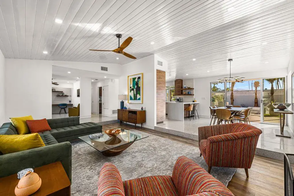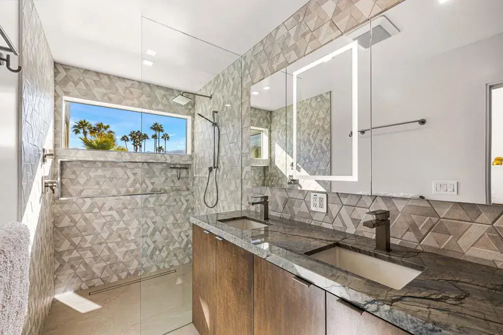 This sophisticated architectural standout was reimagined and completed in 2023 by award-winning architect Charles Austin of Configure 8 Studio. The 3-bedroom, 3-bathroom Palm Springs gem has 2300 SF of living space, which includes the newly added detached casita. The interiors & exteriors were meticulously reconstructed with an emphasis on the stunning views of the San Jacinto & Santa Rosa mountains – large clearstory windows & industrial-grade custom doors were used throughout. Exquisite attention to detail and high-end finishes make this a contemporary masterpiece – oversized terrazzo flooring, quartz countertops with waterfall edge, custom walnut & maple cabinetry, wire-brushed hardwood flooring, high-end kitchen appliance package, custom-built walnut desk workstation in the den, handmade architectural interior doors, custom floor moldings, tongue & groove ceiling, custom lighting detail, mid-century breeze block patio wall in the front facade. Huge custom pool & spa with screen logic automation app. 55” smart TV in the primary bedroom, 75” smart TV in the casita living room, and additional TVs in the den and casita bedroom. Professionally staged and fully furnished, the house also has Nest smart thermostat & Alexa Eco speaker. Minutes from world-renowned restaurants, nightlife, art galleries, shopping, hiking, and golf! Come enjoy this quintessential Palm Springs getaway!