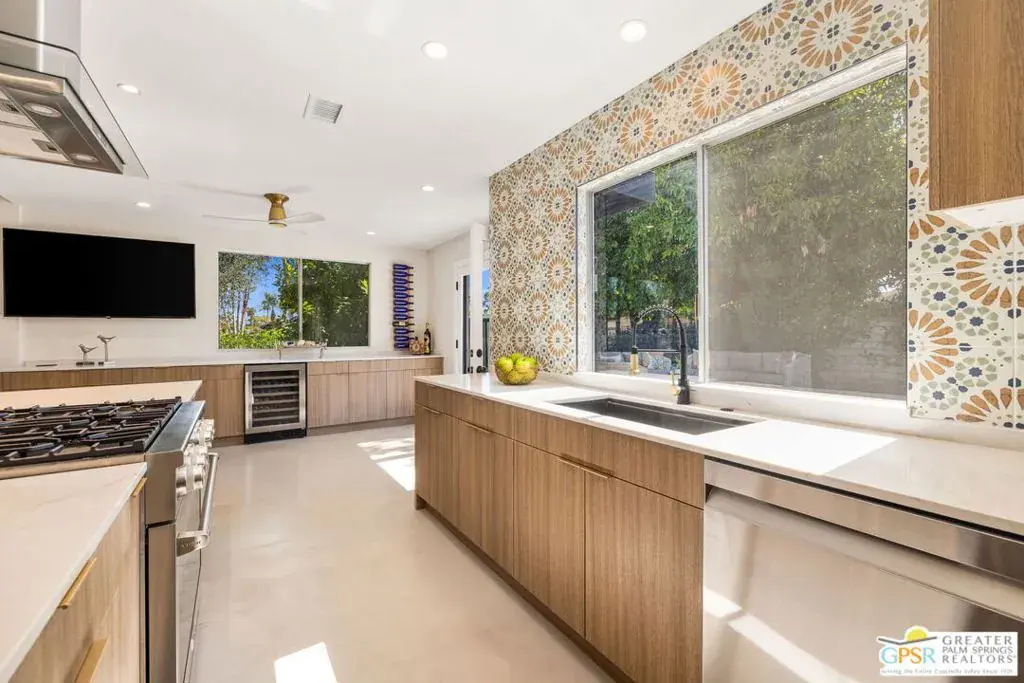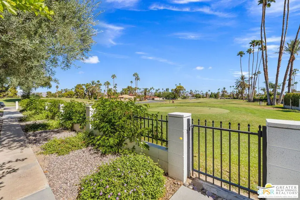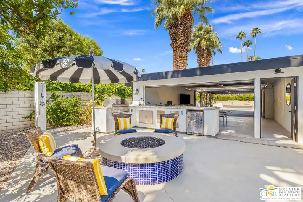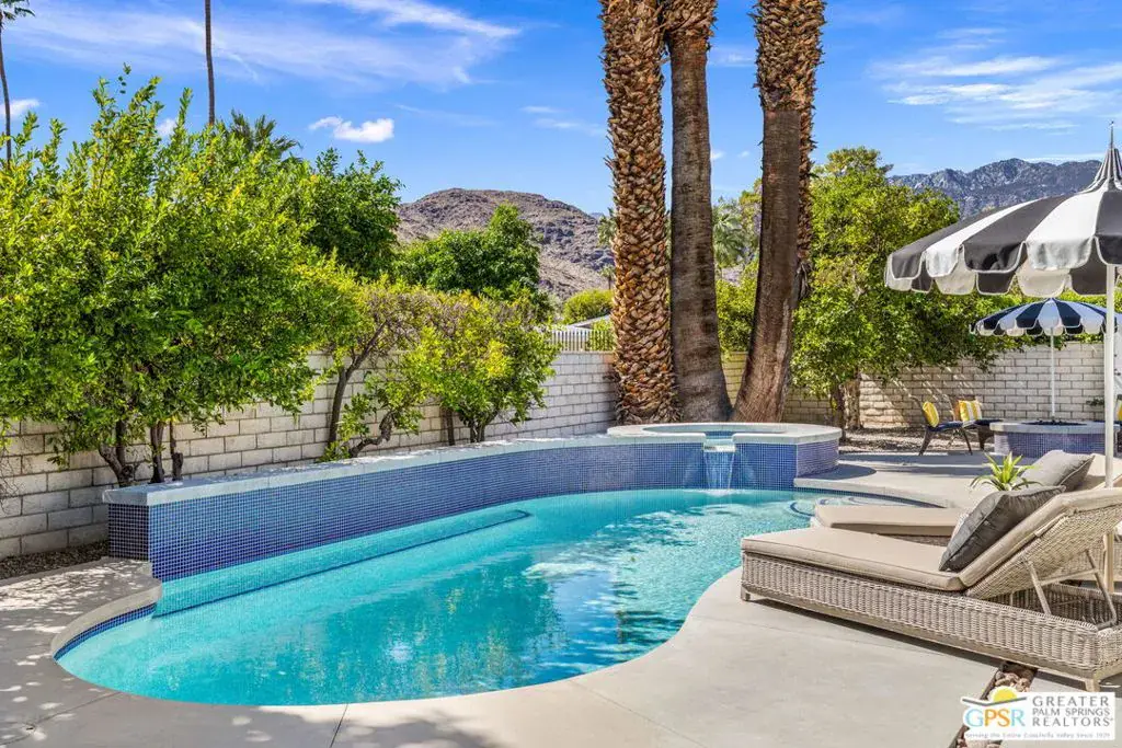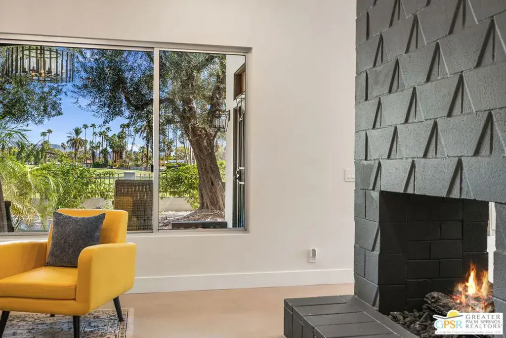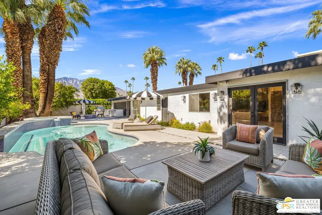 Wow! Mid-century MAGIC circa 1962, built for the Palm Springs good life on the South end of town where pool, mountain, and fairway views come together. Positioned between the 6th and 7th fairways of the Legend Course at Tahquitz Creek Golf Club, this home has no HOA nor land lease and captures the very essence of desert resort living. This gorgeous architectural home has been thoughtfully updated, blending timeless character with modern livability. Vaulted ceilings and a dual sided vintage block fireplace anchor the living and dining areas, while the all new kitchen takes center stage for entertaining, complete with an oversized island and a long buffet bar with beverage fridge overlooking the fairway. Outdoor living shines under swaying palms and mountain views, with a sparkling pool and spa accented by a soothing waterfall. Currently eligible for a short term rental permit, this home offers flexibility for both full time residents and investors alike. Don’t miss the fabulous conversation areas tucked away and perfect for watching golfers tee off, definitely a unique part of this special home. All bedrooms enjoy excellent separation. The primary suite opens to a patio and features fantastic finishes, a separate tub and shower, and a walk in closet. Guest Bedroom 2 opens to the pool area and shares an updated bath with Guest Bedroom 3 which includes its own sitting area. The list of updates both inside and out is extensive, including new pool decking, circular fire pit, outdoor shower, and outdoor kitchen, plus a new roof, HVAC, smooth stucco, updated electrical and lighting, and epoxied concrete floors underfoot. Take the Matterport Virtual Tour for a better sense of flow.