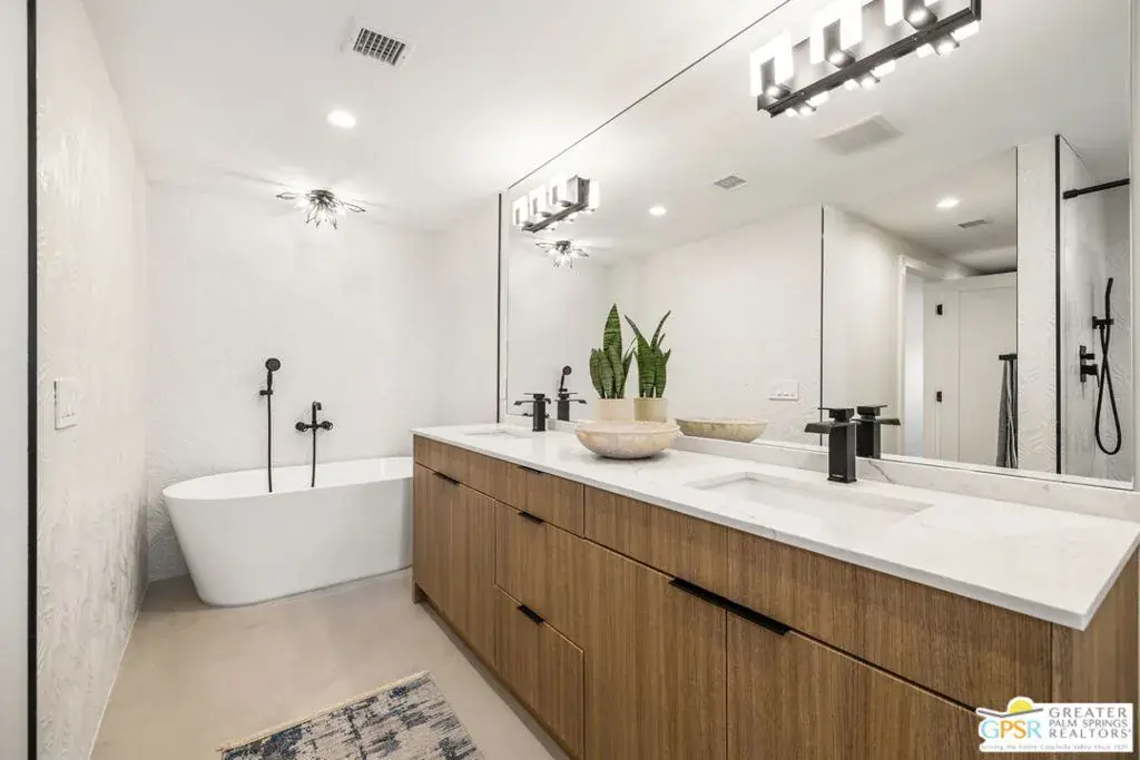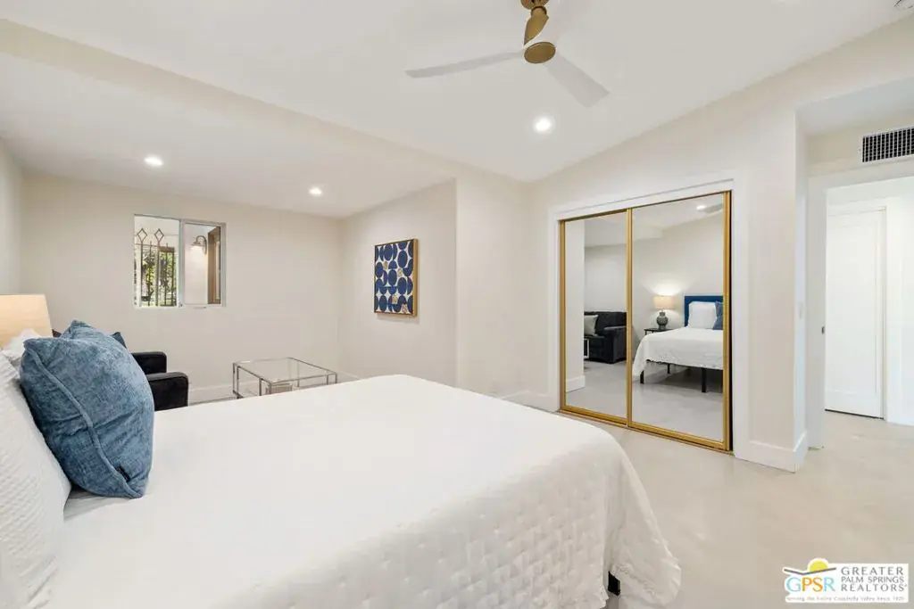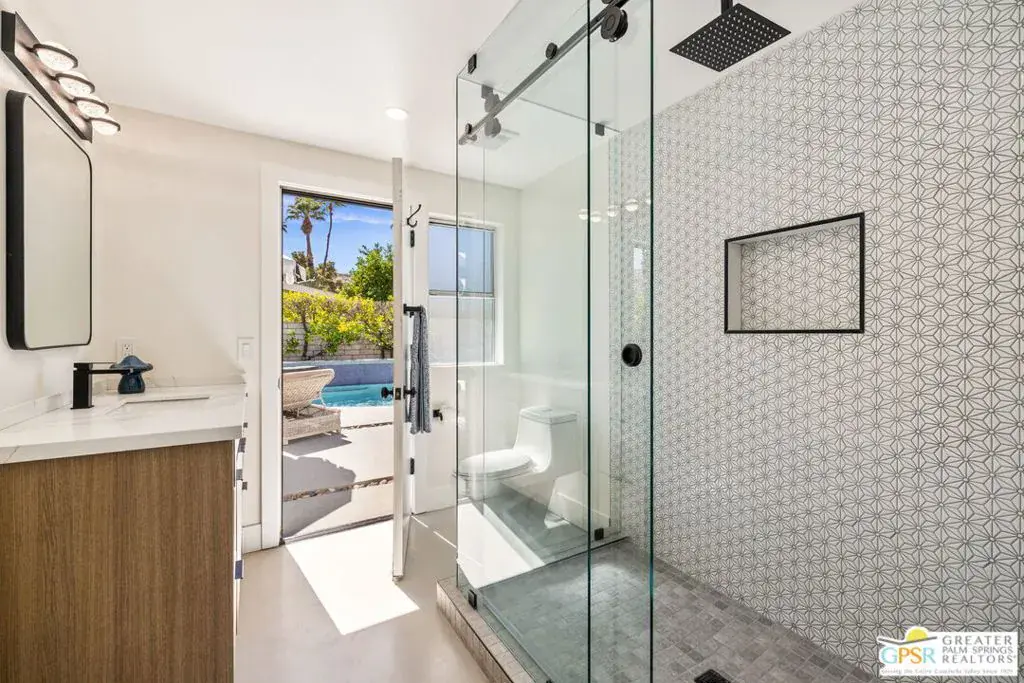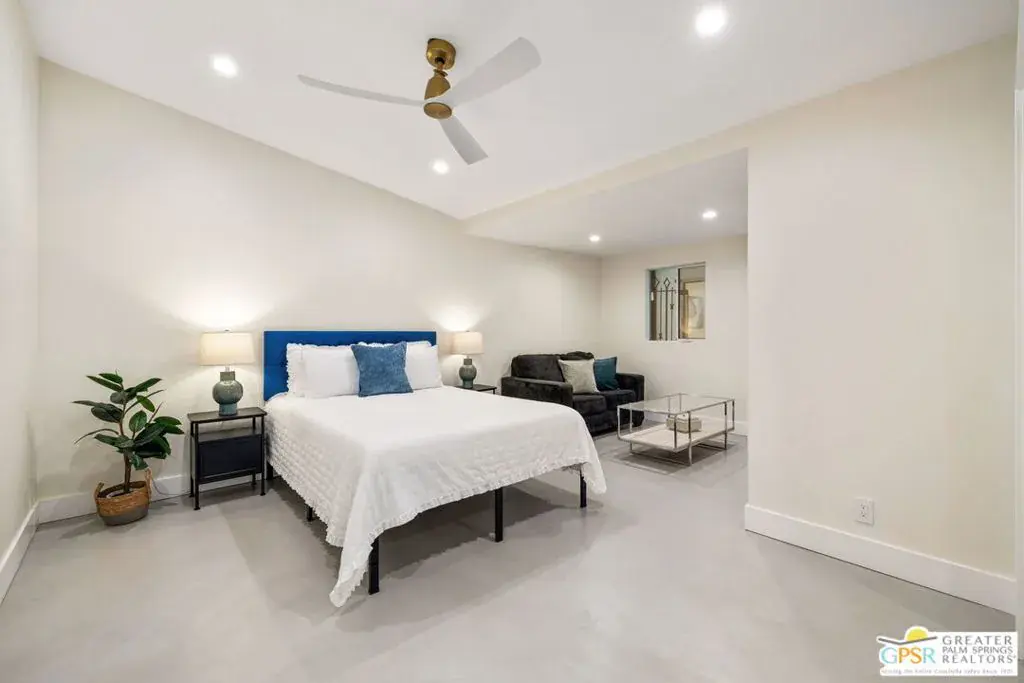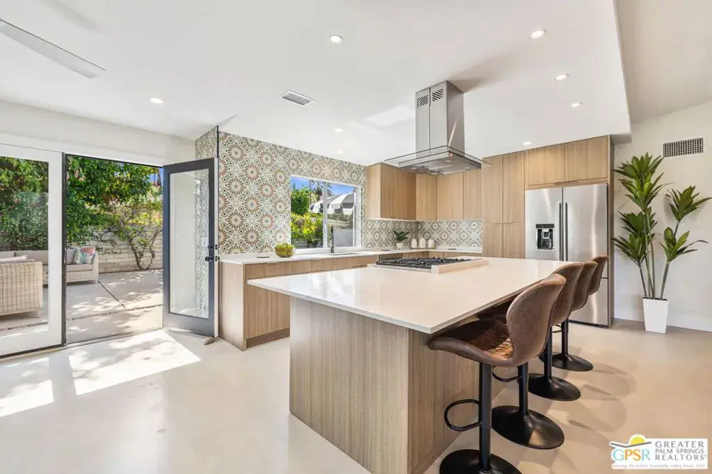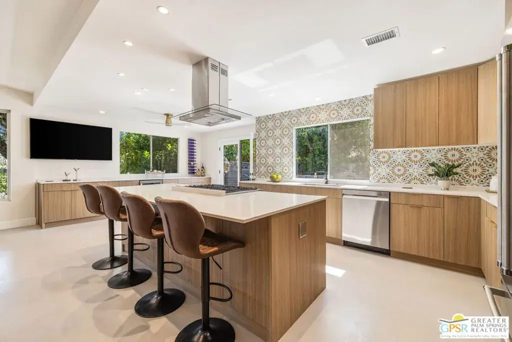 Wow! Mid-century MAGIC circa 1962, built for the Palm Springs good life on the South end of town where pool, mountain, and fairway views come together. Positioned between the 6th and 7th fairways of the Legend Course at Tahquitz Creek Golf Club, this home has no HOA nor land lease and captures the very essence of desert resort living. This gorgeous architectural home has been thoughtfully updated, blending timeless character with modern livability. Vaulted ceilings and a dual sided vintage block fireplace anchor the living and dining areas, while the all new kitchen takes center stage for entertaining, complete with an oversized island and a long buffet bar with beverage fridge overlooking the fairway. Outdoor living shines under swaying palms and mountain views, with a sparkling pool and spa accented by a soothing waterfall. Currently eligible for a short term rental permit, this home offers flexibility for both full time residents and investors alike. Don’t miss the fabulous conversation areas tucked away and perfect for watching golfers tee off, definitely a unique part of this special home. All bedrooms enjoy excellent separation. The primary suite opens to a patio and features fantastic finishes, a separate tub and shower, and a walk in closet. Guest Bedroom 2 opens to the pool area and shares an updated bath with Guest Bedroom 3 which includes its own sitting area. The list of updates both inside and out is extensive, including new pool decking, circular fire pit, outdoor shower, and outdoor kitchen, plus a new roof, HVAC, smooth stucco, updated electrical and lighting, and epoxied concrete floors underfoot. Take the Matterport Virtual Tour for a better sense of flow.