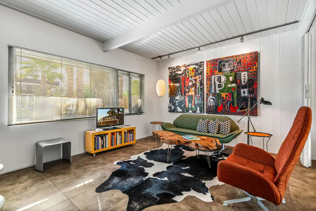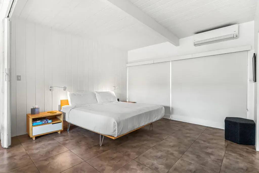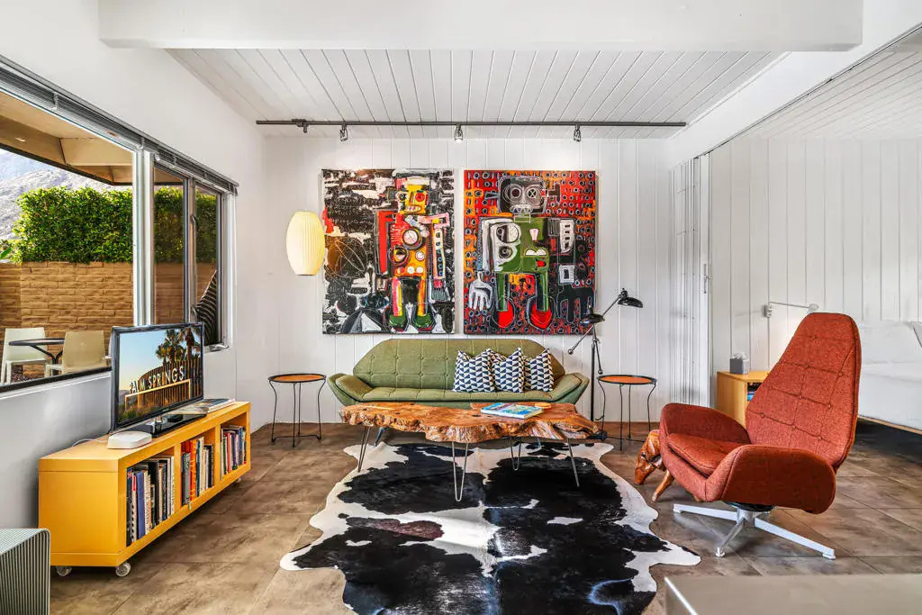 The Desert Star, Howard Lapham, 1956. A rare offering in this very special and architecturally significant condominium complex. A designated class 1 Historic Site, unit #4 benefits from Mills Act tax credits. 572 square feet of efficiency provides living, dining, kitchen and bath in finely detailed architecture. The well equipped kitchen includes high end appliances and plentifull storage. The generously sized bath has a walk-in shower and multi-purpose spa style shower settings. The sleeping chamber is separated, when desired, from the living area, by an original folding screen; creating privacy when needed. Custom window treatments, a mini-split heating and air-conditioning provides year-round comfort. The large private patio affords out door space adjacent to the unit giving the unit an indoor-outdoor flow. Fruit trees, mature plantings, BBQ/fire pit plus stylish seating areas contribute to the lifestyle enhancements.