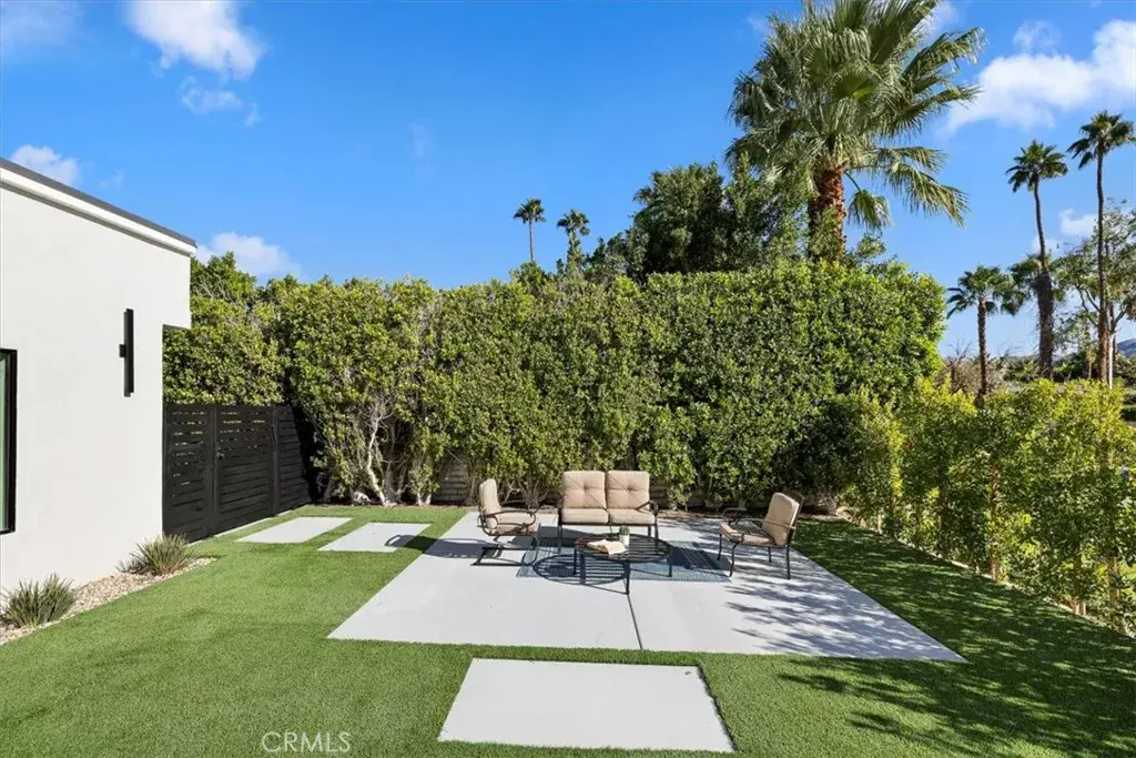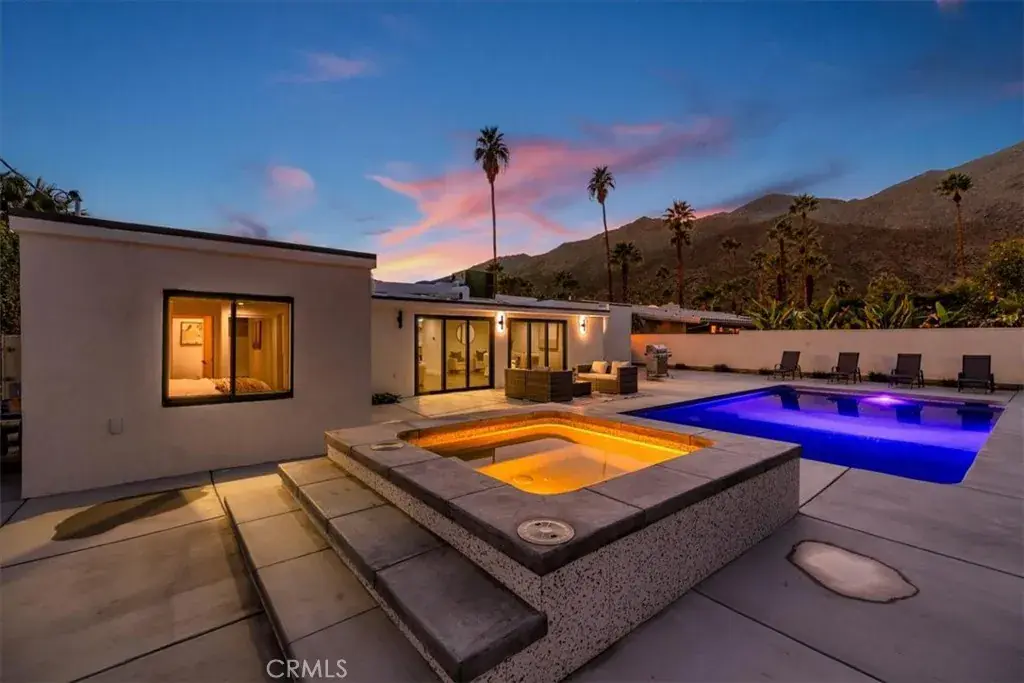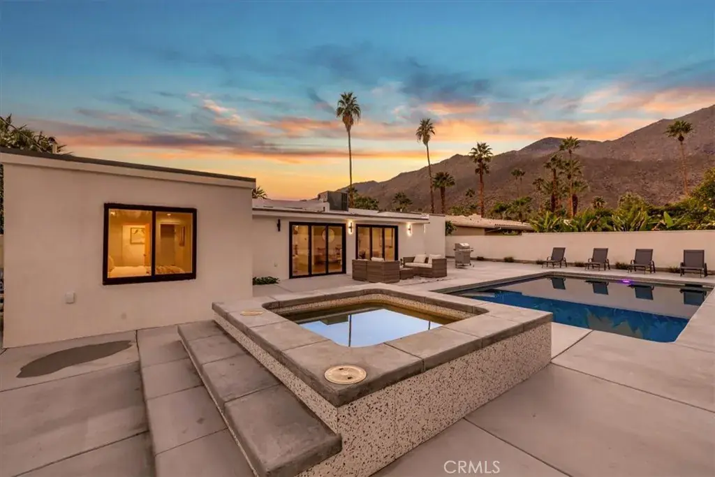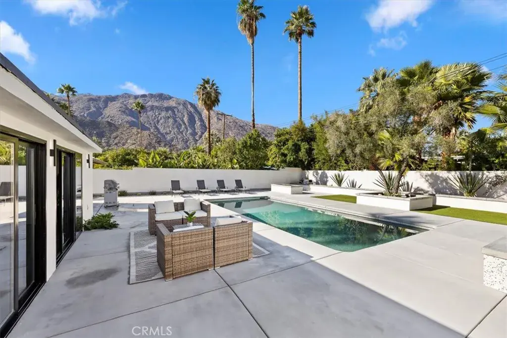 The backyard delivers the ultimate Palm Springs resort experience with a newly renovated inground pool & spa, expansive patios, modern hardscaping, privacy walls, mature palms, and unobstructed desert hill and mountain vista views; ideal for entertaining or peaceful sunset evenings.