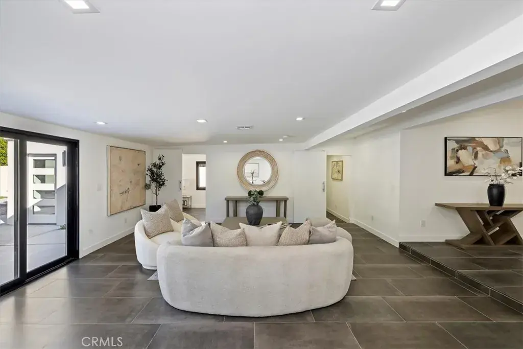 A sleek modern entry leads into an expansive living and dining area with oversized sliders showcasing stunning mountain views and true indoor/outdoor flow. The showpiece chef’s kitchen features a massive waterfall island, custom cabinetry, premium quartzite slab counters, full slab backsplash, stainless steel appliances, double ovens, a 6-burner range, wine/beverage storage, and designer lighting.