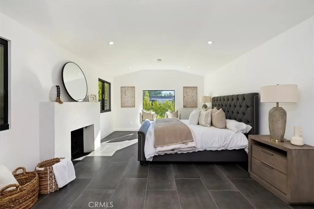 The primary suite is a private retreat with vaulted ceilings, a modern fireplace, picture-window views, a walk-in closet, and a spa-caliber bathroom with an oversized glass shower, dual rainheads, skylight, floating vanity, and premium tilework. Three additional bedrooms offer exceptional versatility, including two en-suite rooms perfect for guests, multigenerational living, or home office needs. All bathrooms feature frameless glass showers, LED-lit mirrors, and floating vanities.