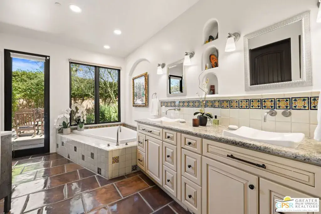 One-of-a-kind designer residence located within blocks of Downtown Palm Springs redefines luxury! Located in South Palm Springs, this Tahquitz River Estates property is a flawless fusion of timeless craftsmanship and modern sophistication delivering an extraordinary lifestyle experience that is serene, private, and undeniably stylish! Inside, expansive 10-foot ceilings, curated designer finishes, and a true indoor-outdoor flow create an atmosphere that is both elevated and effortless. The gourmet kitchen with newly installed appliance suite is a showstopper, equipped with a prep island, induction cooktop with pot filler, double ovens, built-in refrigerator, and rich wood cabinetry all anchored by a rare 1930s French chandelier that casts a warm, vintage glow over the dining space. The level of detail and thought throughout the home is unmatched: heated floors in the primary bath, handcrafted Saltillo tile, solid-core doors, fire sprinklers, designer lighting, and custom millwork throughout. A comprehensive list of upgrades includes a fully owned 48-panel solar system, dual tankless water heaters, a whole-home water filtration system, central vacuum (2024), whole-house sound, and two newly installed HVAC systems all designed for ease, efficiency, and long-term comfort. Step outside and discover your private resort: a glass-tiled pool and spa with heating and cooling functions, surrounded by lush landscaping inspired by the Tuscan countryside including 10 pomegranate trees, 6 mature olive trees, and commercial-grade evening lighting. Gather under the stars with a custom pizza oven, built-in BBQ, fire pit, and outdoor shower perfect for unforgettable desert evenings. Even the garage is elevated, featuring epoxy flooring, mini-split climate control, overhead storage, and custom cabinetry for ultimate functionality. Sited on fee land (you own it) and just moments from downtown Palm Springs, world-class restaurants, galleries, hiking trails, and golf, this home is more than just a residence it’s a statement of refinement, comfort, and inspired desert living.