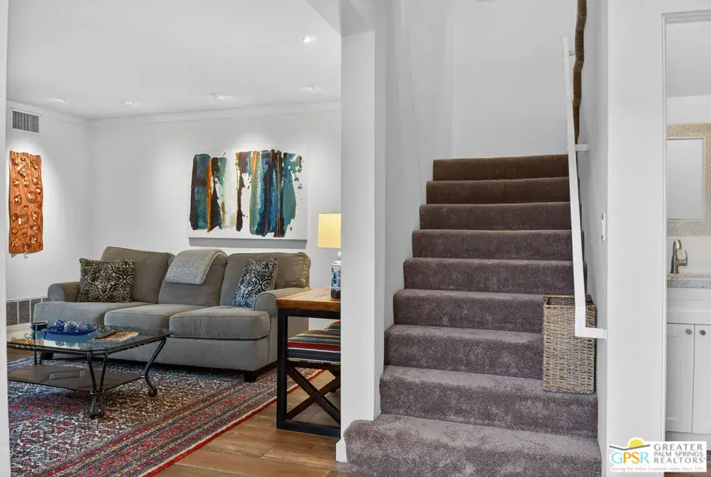 Live at the heart of Palm Springs history and lifestyle in this exceptional residence located in the iconic Historic Tennis Club neighborhood, one of the city’s most prestigious, walkable, and architecturally rich enclaves. Set within Desert Seville, a gated boutique community of just four residences, this beautifully updated home offers approximately 1,592 sq. ft., two spacious primary suites, 2.5 baths, and two private patios, blending timeless Palm Springs character with modern comfort, efficiency, and thoughtful design. The flexible floor plan features dual primary bedrooms, each with walk-in closets and en-suite baths, ideal for full-time living, guests, or a refined second home. Light-filled interiors showcase Milgard doors and windows, updated interior lighting, newer tile flooring, and a stylish kitchen highlighted by a farmhouse sink, modern appliances, and coordinated hardware throughout, creating a polished, cohesive look. Beyond the square footage, the home offers several “hidden bonus” spaces that elevate everyday living, an under-the-stairs grandkids’ hideaway/library/play area, plus a private office discreetly tucked behind a barn door, perfect for remote work or creative pursuits. Recent upgrades add exceptional value and peace of mind, including a high-efficiency Trane XV18 heat pump (2023), an owned Renova solar system with 14 panels, new water heater (2022), decorative front door glass insert (2024), and new stairway carpet (2025). Residents enjoy resort-style community amenities including a pool, spa, fire pit, secure gated entry, and two assigned parking spaces, all within a serene, private setting. Best of all, this unbeatable location places you just three blocks from the newly reopened Historic Plaza Theatre and moments from Palm Springs’ most celebrated dining and social scene, Le Vallauris, Spencer’s, Lulu, Kaiser Grille, Johannes, Pomme Frite, Sherman’s Deli, Tyler’s, Zin, and Johnny Costa’s all an easy walk from your front door. Surrounded by iconic architecture and Hollywood legacy, the Historic Tennis Club neighborhood represents the very best of Palm Springs living. Opportunities to own in this location, especially within such a small, well-maintained community, are exceptionally rare. Historic. Walkable. Energy-efficient. Effortlessly Palm Springs.
