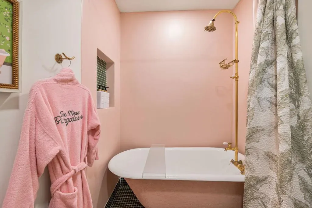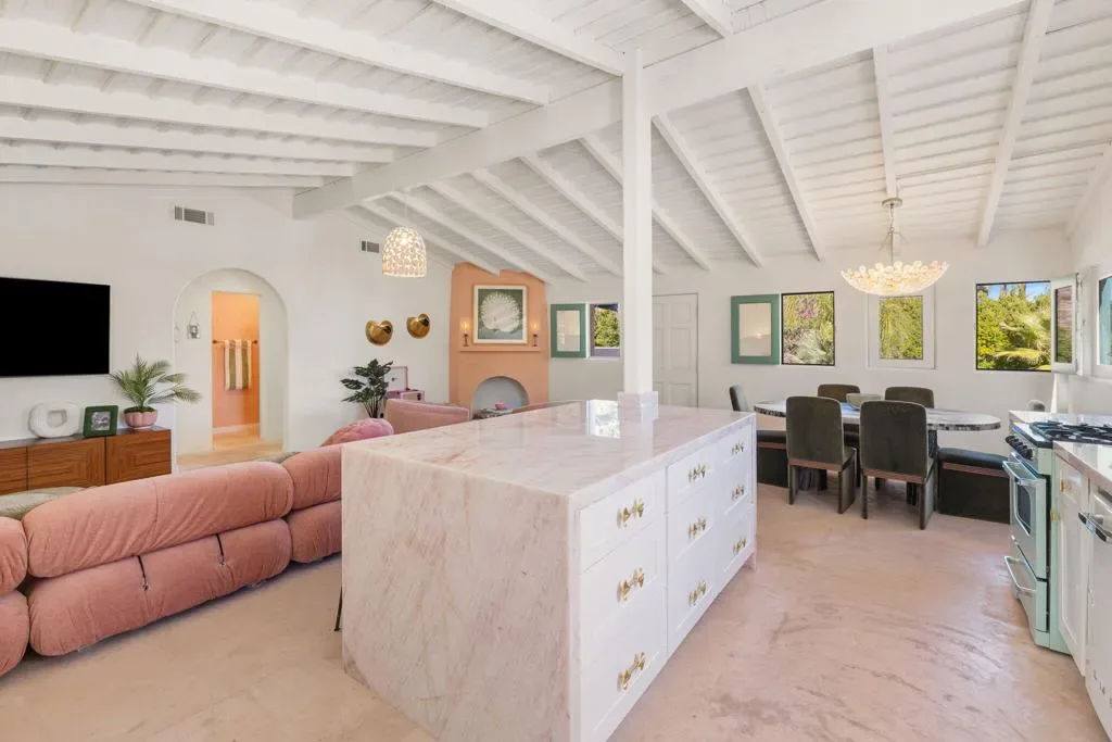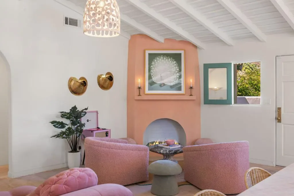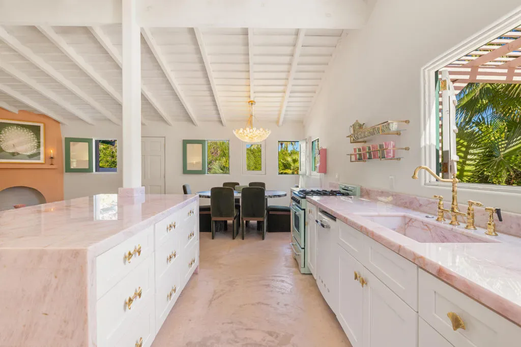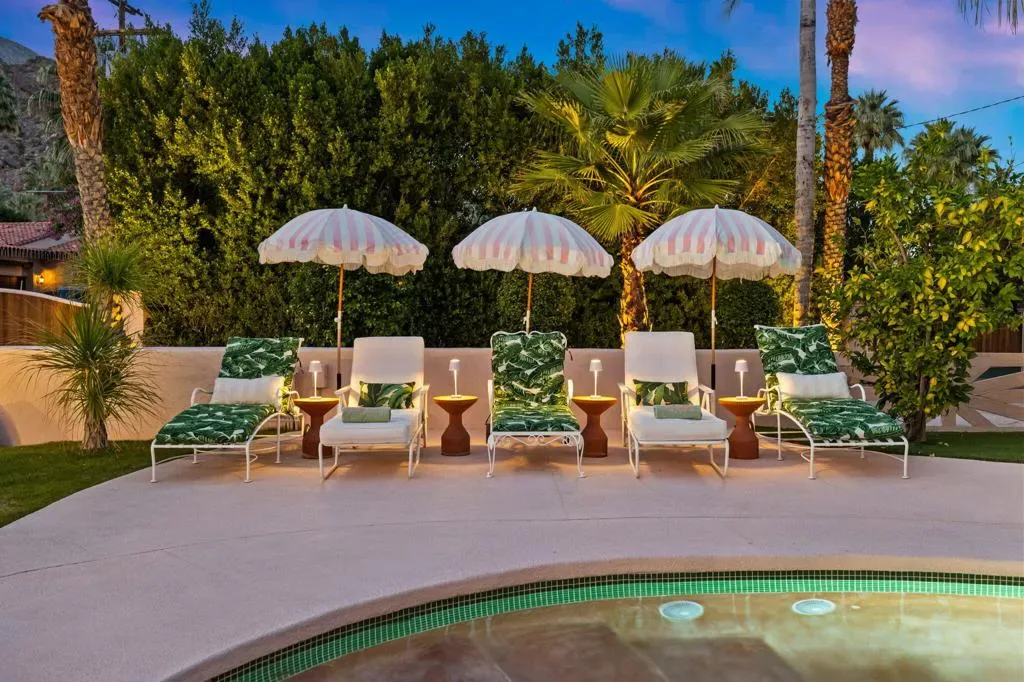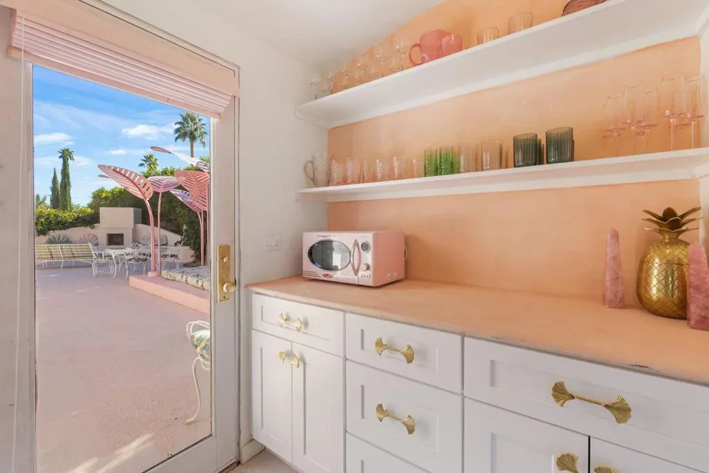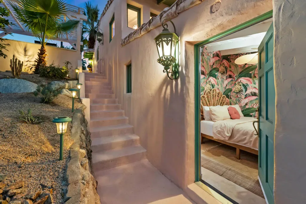 The Mesa Bungalows is a bold and iconic Palm Springs estate, privately gated and set in the coveted neighborhood of The Mesa in South Palm Springs. Originally built in 1937, this Spanish style villa was designed as both a showpiece and a resort-style retreat, with a vintage pink and green palette inspired by the Beverly Hills Hotel and Jayne Mansfield’s iconic Pink Palace. The outdoor experience is nothing short of extraordinary–featuring a custom putting green, a pink kidney-shaped pool and spa with a cascading rock waterfall, an ornate gazebo, and water fountain. An upper level entertaining space showcases a built-in BBQ, fireplace, and a daybed shaded by large pink metal palm fronds. Inside, the home continues its unapologetically chic aesthetic with a fully curated pink interior. The kitchen is outfitted with statement-making Smeg appliances and bold pink quartz countertops, blending playful glamour with modern sophistication. Four separate en-suite bedrooms sprawl the two levels of the home, including one with its own private sun deck overlooking the property. Every detail has been carefully considered to celebrate color, design, and the indoor-outdoor lifestyle Palm Springs is known for. Striking, expressive, and undeniably exclusive, Mesa Bungalows is not just a home–it’s a destination, a statement, and a true Palm Springs original perfect for short-term rentals or a private getaway. Schedule your tour today!