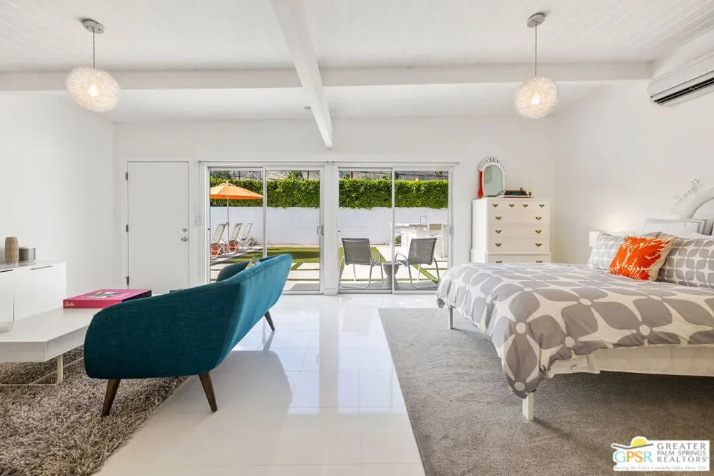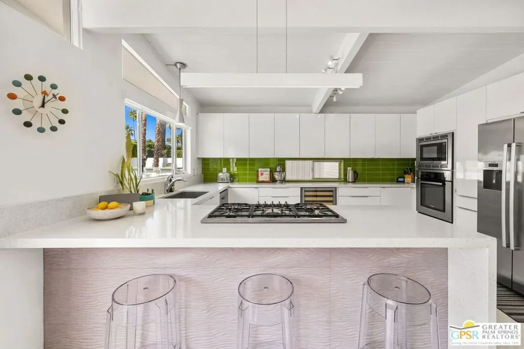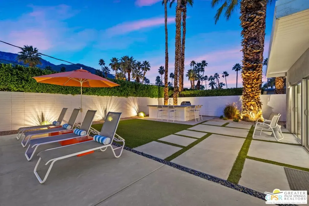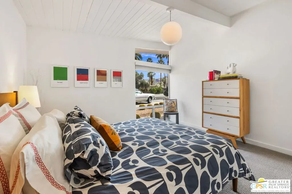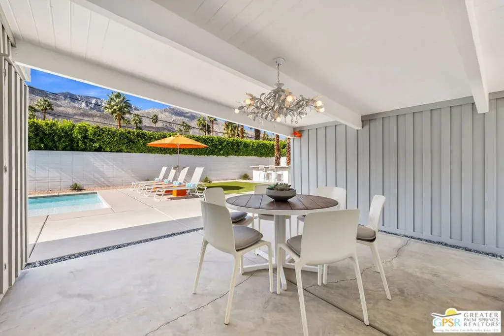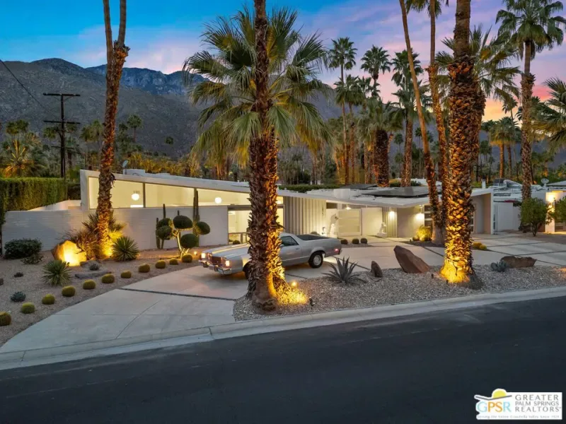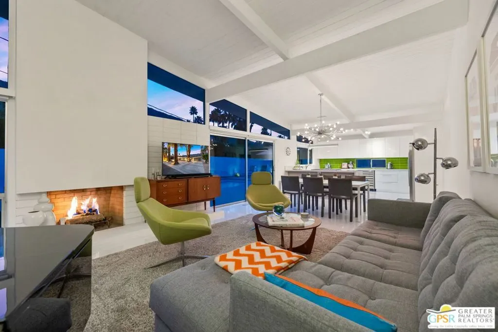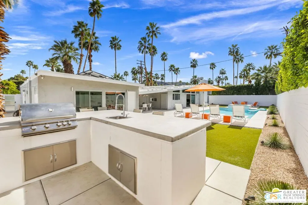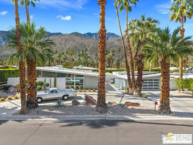 A rare convergence of architectural significance, exceptional condition, and prime location, this iconic William Krisel-designed, Alexander-built home is a standout offering in the highly coveted Twin Palms neighborhood of South Palm Springs. Defined by its classic butterfly roofline, this home embodies the very essence of timeless Palm Springs Mid-Century Modernism updated with modern-day comfort and conveniences. As Krisel intended, the home features a thoughtfully designed and open floor plan, expansive clerestory windows capturing stunning, west-facing, mountain views and filling the home with natural light, tongue and groove ceilings throughout, and a gas fireplace. This residence exudes pride of ownership, thoughtfully renovated with a deep respect for the home’s original design while adding refined, contemporary updates such as porcelain tile flooring, built-in closet cabinetry, renovated bathrooms, and a modernized kitchen featuring custom cabinetry, stainless steel Bosch appliances, a built-in wine refrigerator, quartz countertops, and custom back splash with undercabinet pass thru to the covered outdoor dining area. In addition to the main house, a detached casita offers the flexibility of a spacious fourth bedroom which provides privacy and serenity for guests or acts as a detached workspace or retreat. The enclosed, secluded and secure backyard provides a resort-style sanctuary with an elevated spa spilling into the pool (replastered 2025), water feature, breeze brick wall, gas firepit, outdoor shower, built-in BBQ with counter and sink, private patio off the primary suite, and a combination of lush succulent landscaping and astroturf, all designed for effortless, conservation-friendly, desert living. Additional features include owned solar panels with Tesla Powerwall (home battery), upgraded electrical panel, new foam roof insulation (2018), Ring security system, four outdoor cameras, and covered garage. Exceptional curb appeal with a half-moon driveway on one of the neighborhood’s most beautiful streets. This is a rare opportunity to own a true architectural gem and updated classic. A home that effortlessly balances history, design, comfort, and lifestyle resulting in something that is truly timeless, refined, and unmistakably Palm Springs.