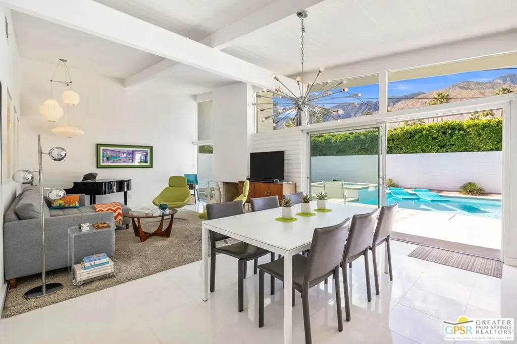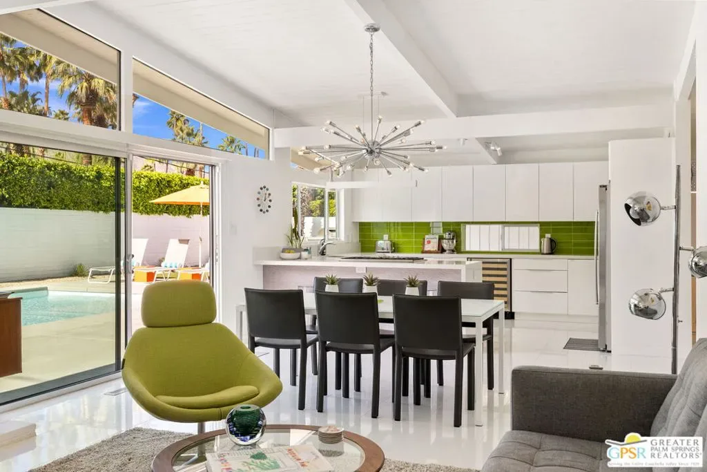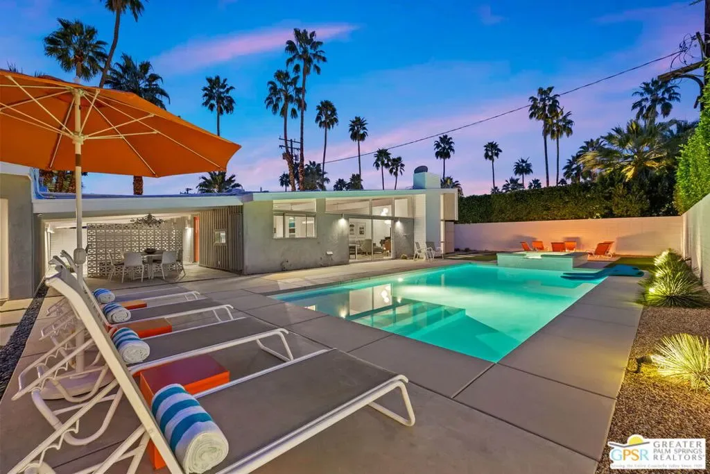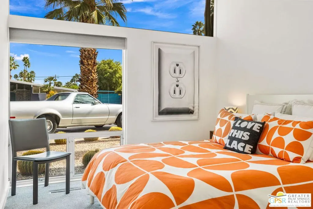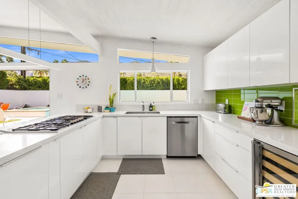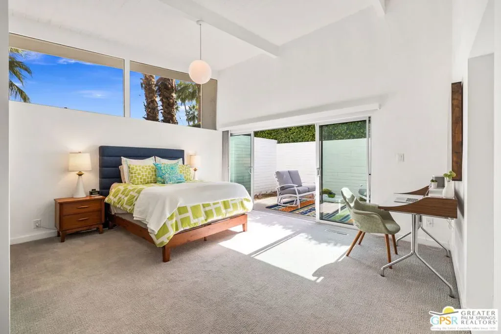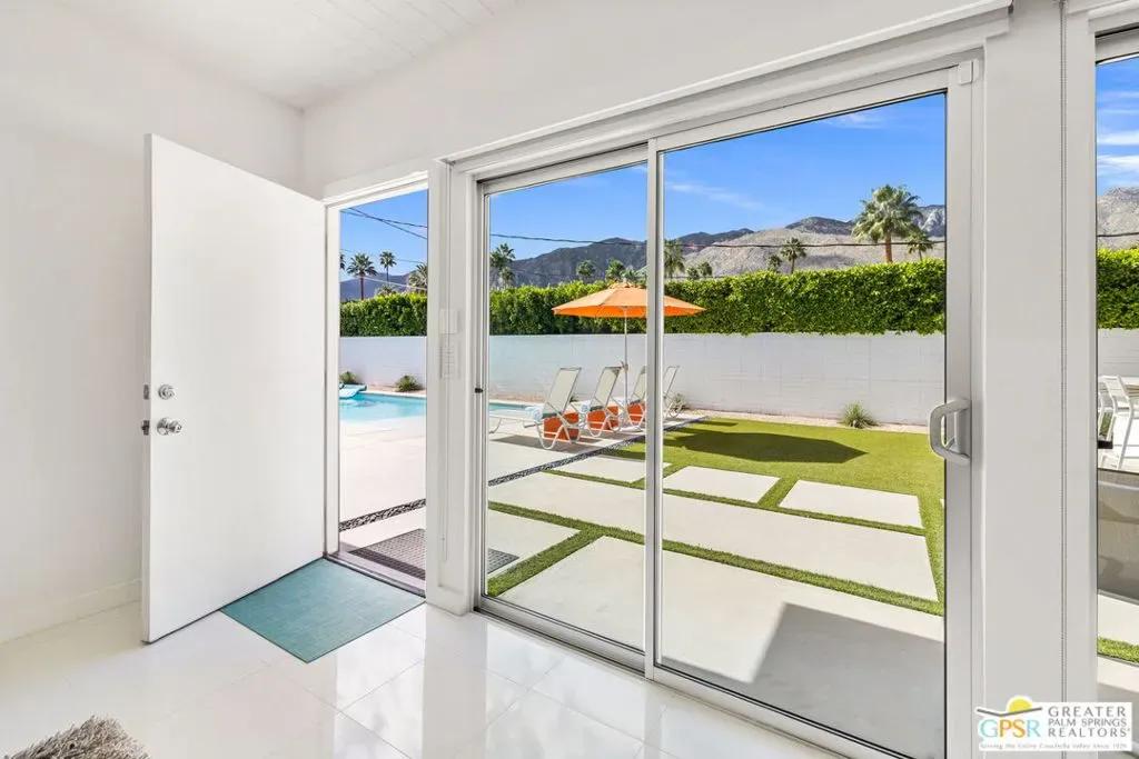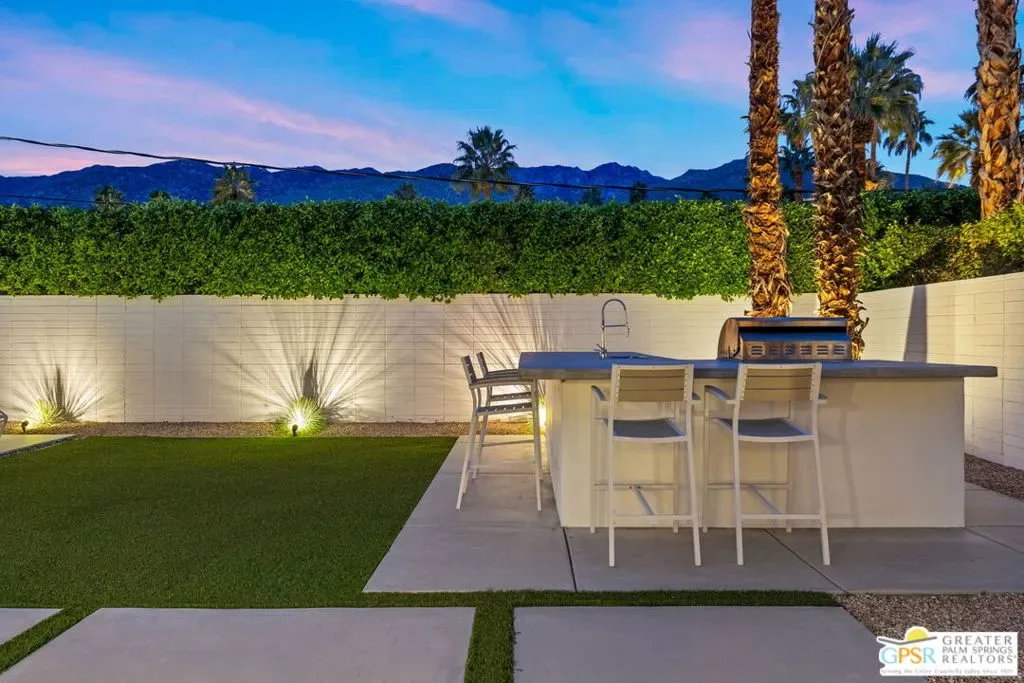 A rare convergence of architectural significance, exceptional condition, and prime location, this iconic William Krisel-designed, Alexander-built home is a standout offering in the highly coveted Twin Palms neighborhood of South Palm Springs. Defined by its classic butterfly roofline, this home embodies the very essence of timeless Palm Springs Mid-Century Modernism updated with modern-day comfort and conveniences. As Krisel intended, the home features a thoughtfully designed and open floor plan, expansive clerestory windows capturing stunning, west-facing, mountain views and filling the home with natural light, tongue and groove ceilings throughout, and a gas fireplace. This residence exudes pride of ownership, thoughtfully renovated with a deep respect for the home’s original design while adding refined, contemporary updates such as porcelain tile flooring, built-in closet cabinetry, renovated bathrooms, and a modernized kitchen featuring custom cabinetry, stainless steel Bosch appliances, a built-in wine refrigerator, quartz countertops, and custom back splash with undercabinet pass thru to the covered outdoor dining area. In addition to the main house, a detached casita offers the flexibility of a spacious fourth bedroom which provides privacy and serenity for guests or acts as a detached workspace or retreat. The enclosed, secluded and secure backyard provides a resort-style sanctuary with an elevated spa spilling into the pool (replastered 2025), water feature, breeze brick wall, gas firepit, outdoor shower, built-in BBQ with counter and sink, private patio off the primary suite, and a combination of lush succulent landscaping and astroturf, all designed for effortless, conservation-friendly, desert living. Additional features include owned solar panels with Tesla Powerwall (home battery), upgraded electrical panel, new foam roof insulation (2018), Ring security system, four outdoor cameras, and covered garage. Exceptional curb appeal with a half-moon driveway on one of the neighborhood’s most beautiful streets. This is a rare opportunity to own a true architectural gem and updated classic. A home that effortlessly balances history, design, comfort, and lifestyle resulting in something that is truly timeless, refined, and unmistakably Palm Springs.