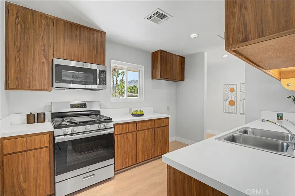 The primary suite comfortably fits a king bed and offers direct access to the backyard and pool, creating a seamless indoor-outdoor connection. Two additional bedrooms share a central bathroom, offering flexibility for guests, a home office, or additional living needs. Dual-pane windows and sliders enhance efficiency and natural light throughout. Located in a short-term rental-friendly area just minutes from downtown Palm Springs, this home is ideal as a full-time residence, weekend getaway, or investment opportunity.