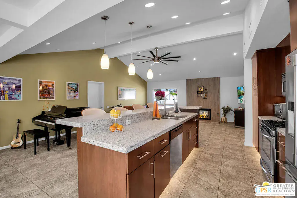 Experience the perfect blend of modern luxury and iconic design in this beautifully renovated and expanded 4-bedroom, 3-bathroom desert retreat originally crafted by acclaimed architect Hugh Kaptur. Offered fully furnished, this home is ideal as a stylish primary residence or a highly desirable vacation rental, especially with the addition of a charming detached casita completed in 2022. Inside, you’ll immediately notice the exceptional craftsmanship and thoughtful finishes throughout. The open-concept great room is an entertainer’s dream, featuring soaring ceilings, a cozy fireplace, and seamless flow between the spacious living area, dining space, and island kitchen with bar seating. The expansive primary suite is a true sanctuary, boasting a luxurious ensuite bathroom with dual vanities and a rain shower, plus a generous walk-in closet. Two additional bedrooms in the main house provide comfortable accommodations for guests or family. The recently added 300 sq ft casita elevates the resort-like atmosphere, featuring floor-to-ceiling glass doors that open to the lush yard and pool. Complete with its own full bathroom (with separate pool access) and a convenient kitchenette, the casita is the perfect hub for all your outdoor entertainment activities. Equipped with its own Eco air system, the casita can be incredibly versatile, also serving as an art studio, gym, or additional bedroom for guests or in-laws. Step outside to your private backyard paradise an inviting, updated saltwater pool and spa surrounded by mature landscaping and multiple lounging areas complete with fire table. This home is fully equipped with smart home technology, automated pool controls, a solar energy system, and EV charging, delivering energy efficiency and modern convenience. To explore the full list of upgrades and features, contact agent to schedule a private tour of this exceptional property or for a link to the virtual tour.