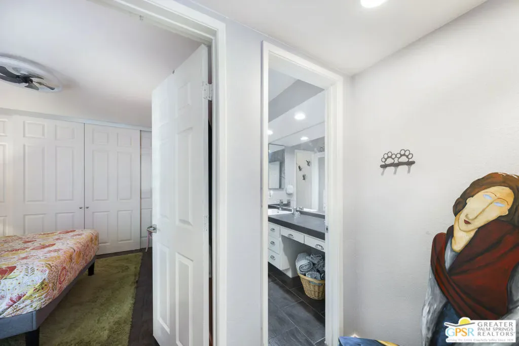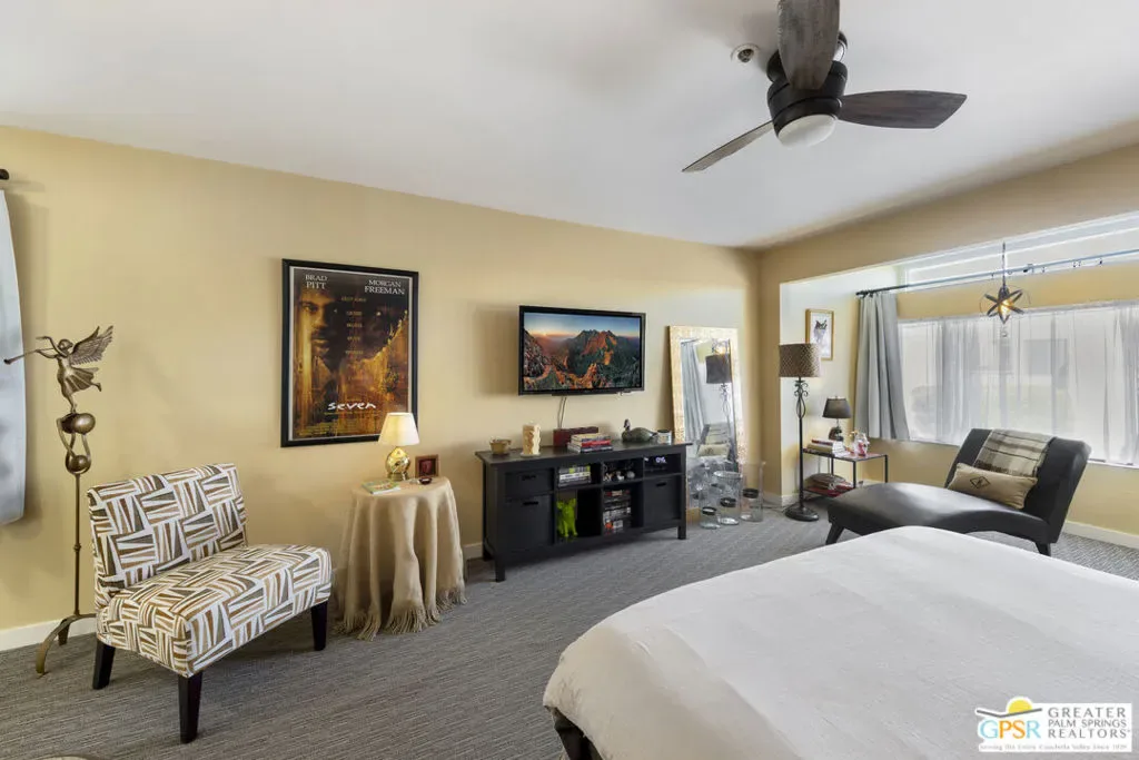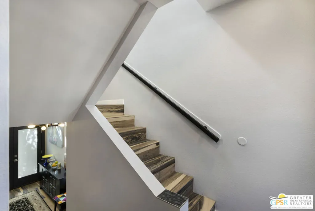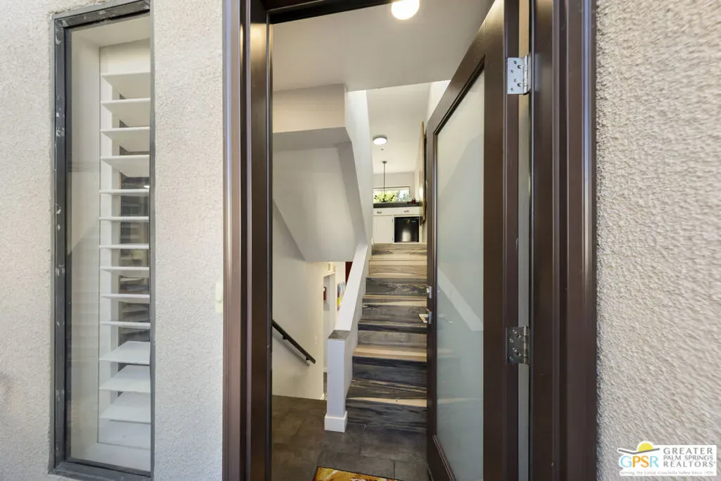Wonderfully appointed 2 bedroom, 2 bath condo in the infamous Village Racquet Club in Central Palm Springs. 4 levels of space and privacy abound, starting with a gourmet kitchen on the ground floor, as well as a formal double door entry, spacious dining area and a breakfast nook/sitting area which opens to a walled patio. The next level has a guest bedroom and a 3/4 bathroom. At the top of the stairs to the next level is a bar area, which opens up into a large living room anchored by a fireplace. There is also an outdoor balcony on this level. The top level hosts a huge Primary bedroom and bathroom, and a roomy walk in closet, as well as a window alcove/retreat area. Great location, downtown Palm Springs is a stone’s throw away! The complex features many amenities including racquet ball, tennis, a clubhouse, fitness center, and 8 pools and spas. Upgrades and replacements include: washer and dryer (2019), refrigerator (2025), stove (2019), microwave (2025), and garbage disposal (2024). Tile floor was installed in 2020, carpet in 2020, fireplace remodeled in 2023. HVAC replaced in 2023, ceiling fans installed in 2023. LED can lights in 2024. chandeliers in 2023, Primary bath fixtures/tib/sinks/vanity in 2023, double front doors at ground level in 2024, ground level patio slider doors/screens in 2024, Primary bedroom window in 2024, upper hallway window in 2022, new paint in 2022, all baseboards in 2022, all door knobs in 2022 and Guest bath fixtures/sink/toilet in 2022.