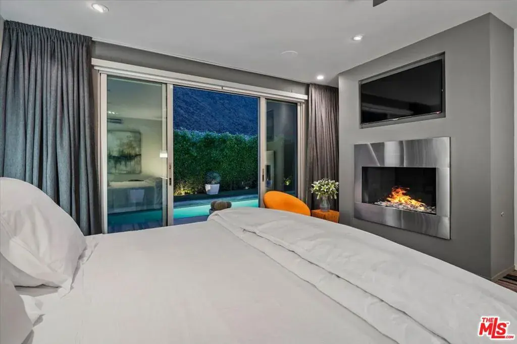 Vista Las Palmas. Gated cul-de-sac of just 12 homes. Last street against the mountains. Quiet, peaceful, no strangers walking their dogs, no sightseers, no tourists and no traffic. The enclosed courtyard entry complete with desert landscaping provides a gateway to this beautifully remodeled and impressive space where at once the backdrop of the San Jacinto mountains becomes the focal point. The spacious open living area features a sunken living room with fire place and floor to ceiling windows opening to the outdoors where the pool, spa, fire pit, fireplace and BBQ beckon. The substantial and bright chef’s kitchen is equipped with sleek stainless steel appliances (including two dishwashers) and two islands that provide space for entertaining in the open living/dining area only steps to the oasis outside. A stylish powder room and secluded den/office/media room lead the way to the bedroom corridor. The generous primary suite with fireplace opens up to the beautifully landscaped and appointed pool and spa dominated by the western view of the mountains. Two additional en-suite bedrooms complete the thoughtful design of this solar powered sanctuary. The peaceful serenity of this home offers the quintessential desert escape-seclusion, security and close proximity to the desert’ s finest restaurants and entertainment.