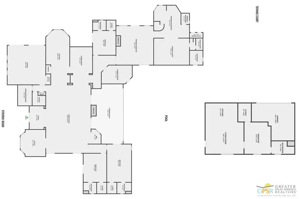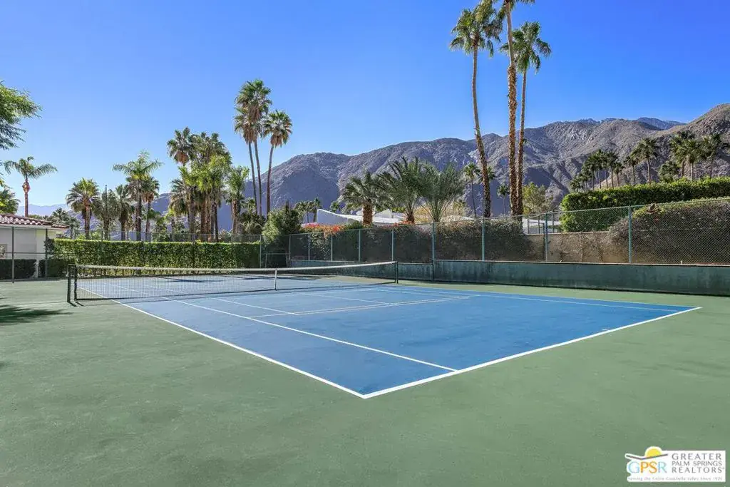 A rare offering in the heart of the desert, this private, gated tennis estate spans 1.15 acres of resort-style living, framed by breathtaking mountain views. Designed for seamless indoor-outdoor flow, the property is an entertainer’s dream whether hosting an intimate gathering or a grand soire. The estate offers a total of five bedrooms and seven baths across the main residence and separate guest accommodations, ensuring privacy and comfort for all. The primary retreat is a true sanctuary, featuring a fireplace, spa-inspired ensuite with a dry sauna, jetted tub, oversized shower, dual vanities, and an expansive walk-in closet. The main living areas include a formal dining room, chef’s kitchen, and dedicated office, all opening to sun-drenched patios and lush, manicured grounds. The backyard is a private resort unto itself, with a stunning pool and spa, multiple outdoor dining and lounge areas, and a full outdoor kitchen with covered seating and built-in heaters for year-round enjoyment. A true rarity in the desert, the full-sized north-south tennis court offers the ultimate experience for players and spectators alike, with easy access via a private driveway. Citrus trees, a misting system, and mature palms enhance the serene ambiance, creating an unparalleled escape. This estate is a showcase of space, privacy, and resort-inspired amenities, all just moments from the best of Palm Springs.