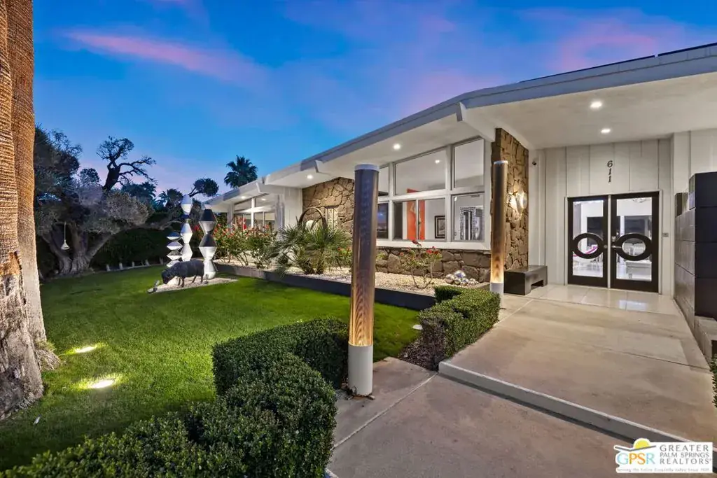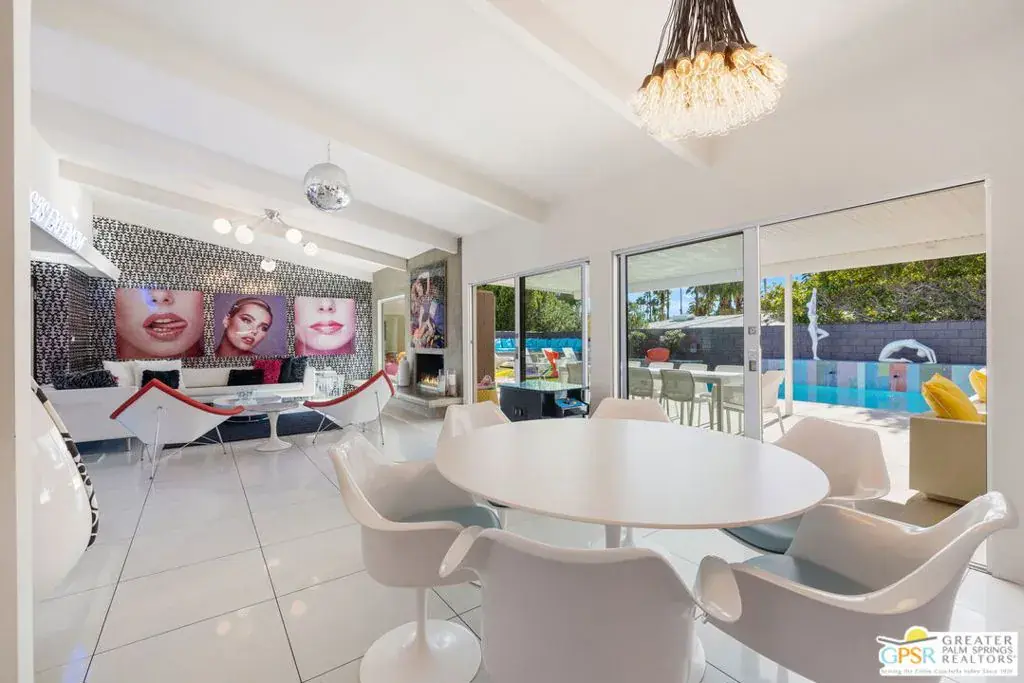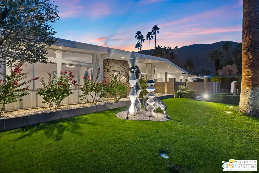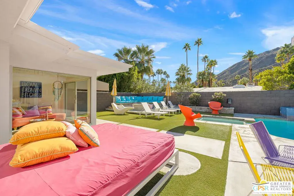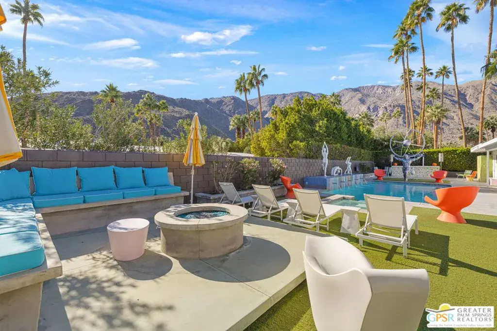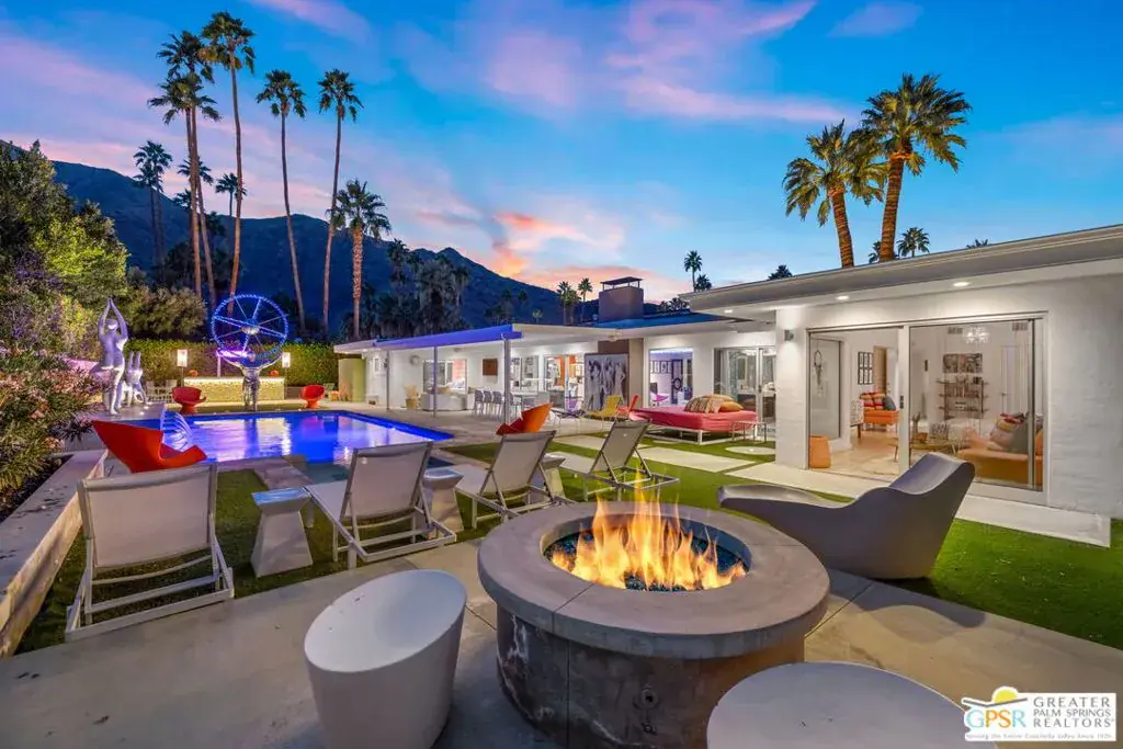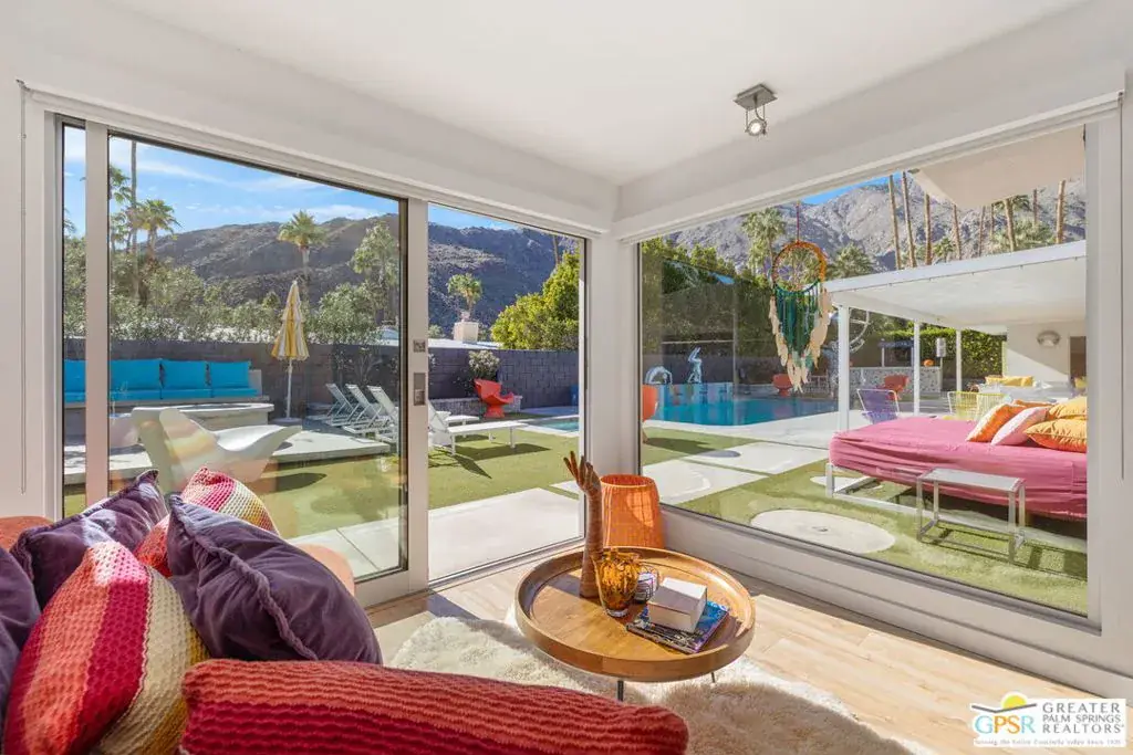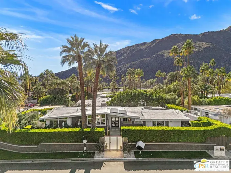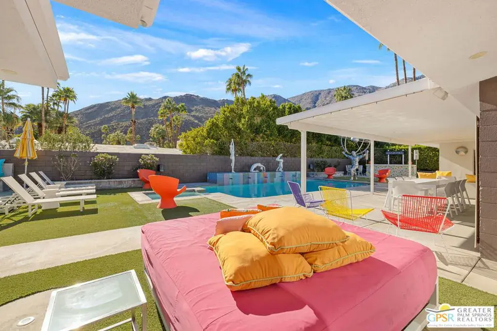 SUCCESSFUL SHORT-TERM VACATION RENTAL in Vista Las Palmas! This iconic 1961 Alexander-built, Charles Dubois, AIA designed post-and-beam residence affectionately known as “Leisureland” represents a rare convergence of architectural pedigree, cultural expression, and fully realized Palm Springs lifestyle. Located just blocks from golf, hiking trails, and Downtown Palm Springs, this TURNKEY FURNISHED home pairs mid-century modern design with carefully curated enhancements that support today’s living. Behind walls and gates, the property unfolds as a private desert compound where classic architecture becomes the canvas for a bold, museum-level celebration of Pop Art. Vivid color, period furnishings, sculptural elements, and curated collectibles are seamlessly integrated throughout, while Fleetwood windows and doors, rooftop solar, and select upgrades enhance livability without compromising architectural integrity. Entertainers and those lucky enough to be invited will appreciate the scale and openness of the living and dining areas, highlighted by vaulted ceilings, a gas fireplace, and two sets of sliding glass doors that extend living outdoors. The south-facing backyard is a showpiece, featuring a striking mosaic water feature framing the pool, expansive seating areas, a covered dining terrace, fire feature, and outdoor barall set against the dramatic mountain backdrop that defines Palm Springs. An adjacent kitchen with quartz countertops and stainless-steel appliances is complemented by a separate den/media room, offering flexibility for everyday living or hosting. The Primary Ensuite features vaulted ceilings and a private retreat, opening to two outdoor areas for true indoor/outdoor living. The ensuite bath offers dual sinks and a large walk-in shower with direct access to the pool and spa. Junior Ensuites Two and Three each feature stylish private baths, connect to their own outdoor patios, and share a separate family room. Bedroom Four offers vaulted ceilings, mountain views, and convenient access to the hallway bath with walk-in shower. A rare opportunity to own one of Palm Springs’ most recognizable and published homes.