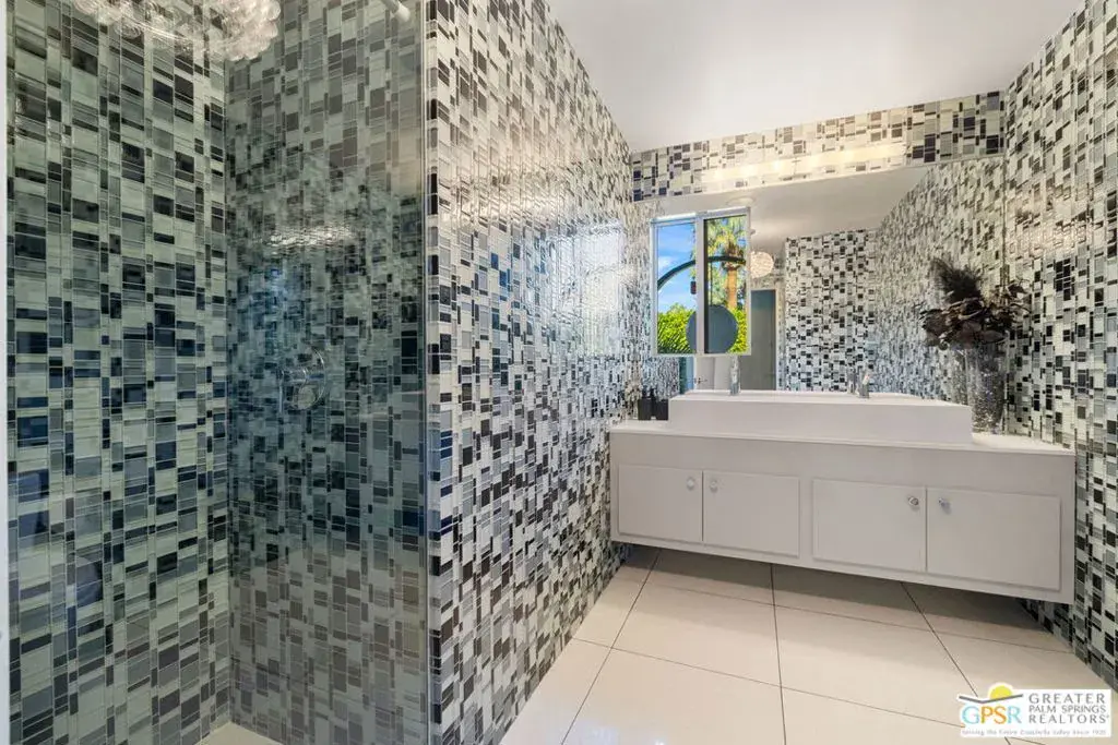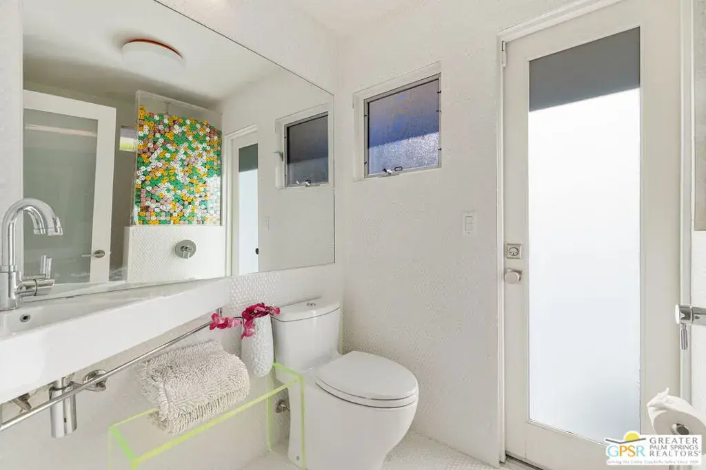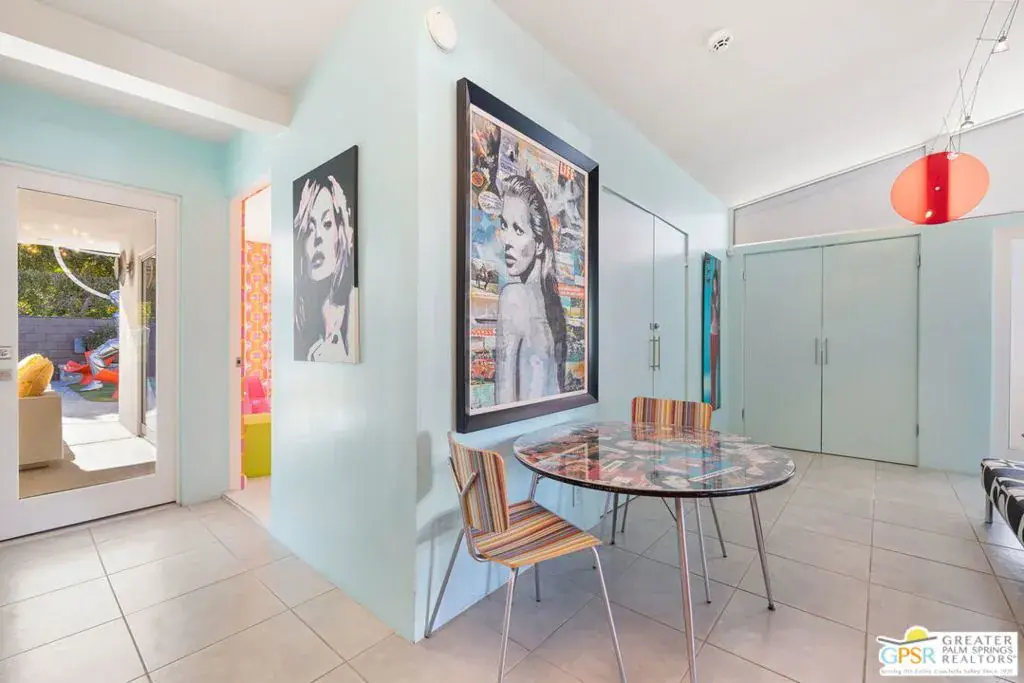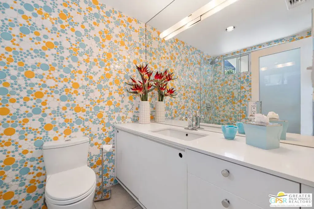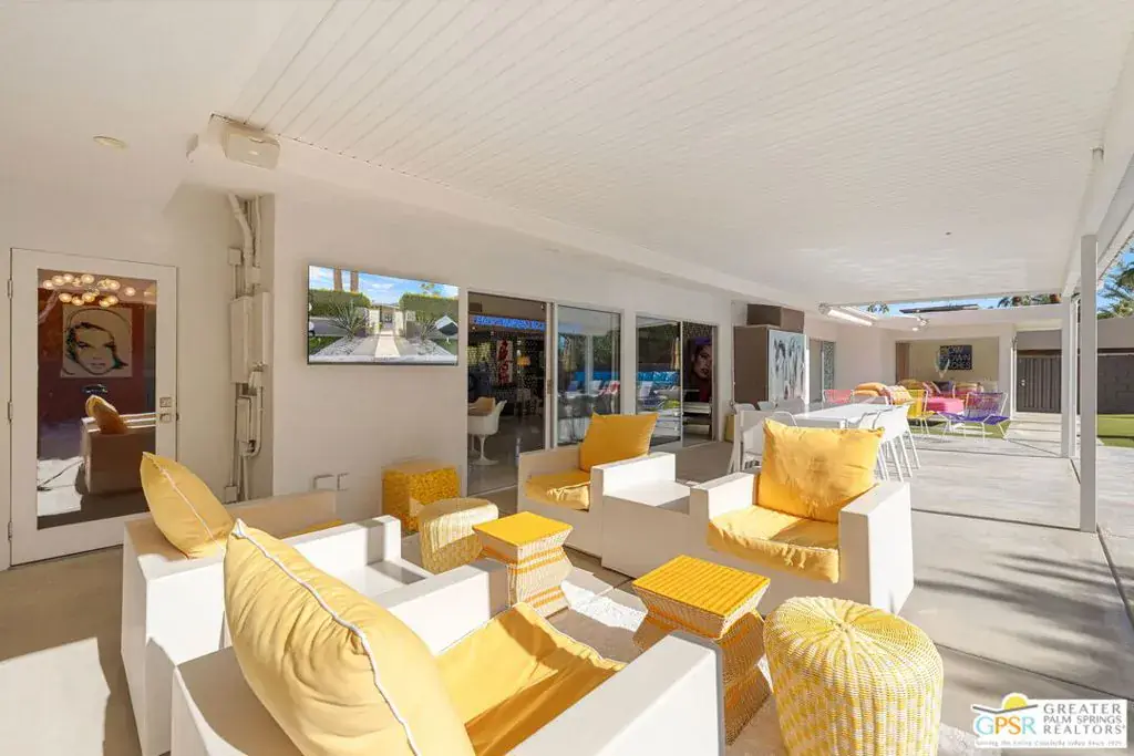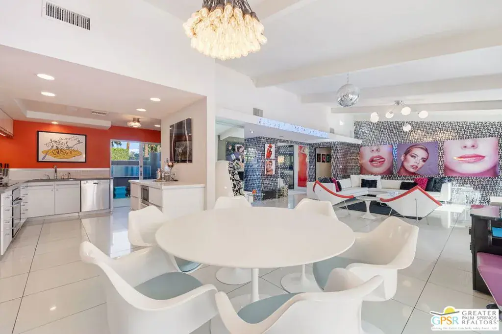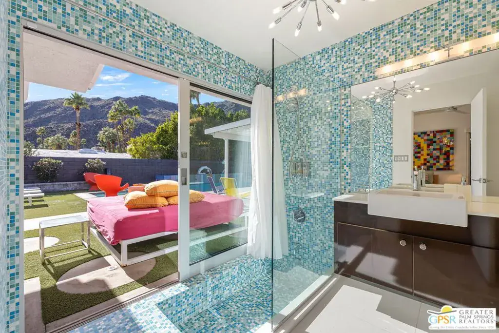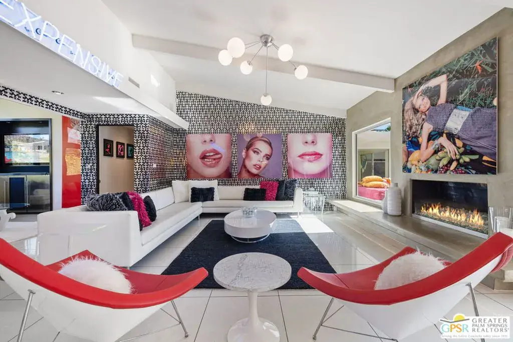 SUCCESSFUL SHORT-TERM VACATION RENTAL in Vista Las Palmas! This iconic 1961 Alexander-built, Charles Dubois, AIA designed post-and-beam residence affectionately known as “Leisureland” represents a rare convergence of architectural pedigree, cultural expression, and fully realized Palm Springs lifestyle. Located just blocks from golf, hiking trails, and Downtown Palm Springs, this TURNKEY FURNISHED home pairs mid-century modern design with carefully curated enhancements that support today’s living. Behind walls and gates, the property unfolds as a private desert compound where classic architecture becomes the canvas for a bold, museum-level celebration of Pop Art. Vivid color, period furnishings, sculptural elements, and curated collectibles are seamlessly integrated throughout, while Fleetwood windows and doors, rooftop solar, and select upgrades enhance livability without compromising architectural integrity. Entertainers and those lucky enough to be invited will appreciate the scale and openness of the living and dining areas, highlighted by vaulted ceilings, a gas fireplace, and two sets of sliding glass doors that extend living outdoors. The south-facing backyard is a showpiece, featuring a striking mosaic water feature framing the pool, expansive seating areas, a covered dining terrace, fire feature, and outdoor barall set against the dramatic mountain backdrop that defines Palm Springs. An adjacent kitchen with quartz countertops and stainless-steel appliances is complemented by a separate den/media room, offering flexibility for everyday living or hosting. The Primary Ensuite features vaulted ceilings and a private retreat, opening to two outdoor areas for true indoor/outdoor living. The ensuite bath offers dual sinks and a large walk-in shower with direct access to the pool and spa. Junior Ensuites Two and Three each feature stylish private baths, connect to their own outdoor patios, and share a separate family room. Bedroom Four offers vaulted ceilings, mountain views, and convenient access to the hallway bath with walk-in shower. A rare opportunity to own one of Palm Springs’ most recognizable and published homes.