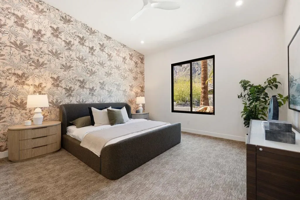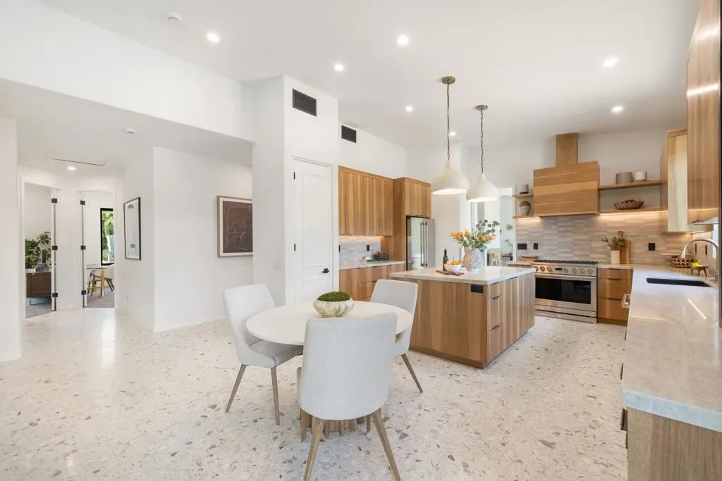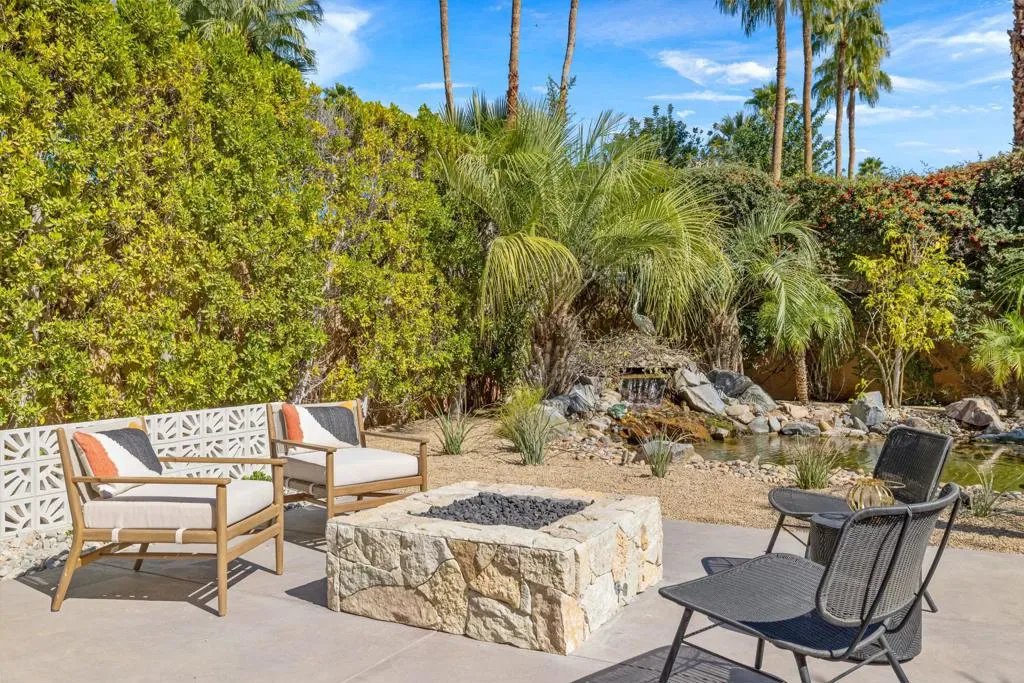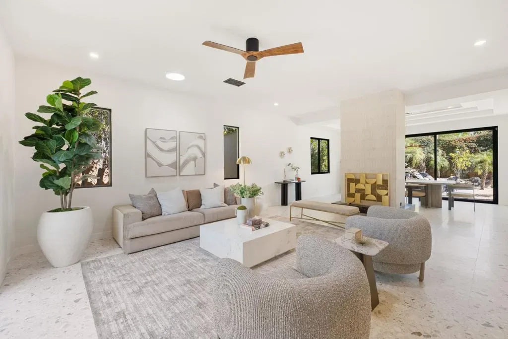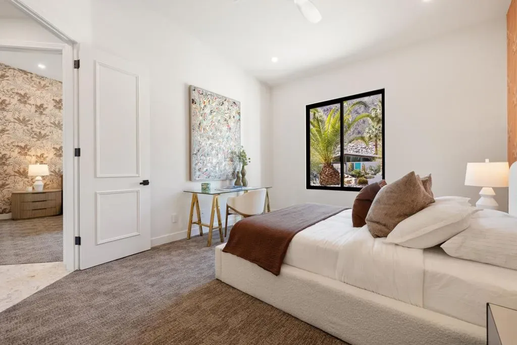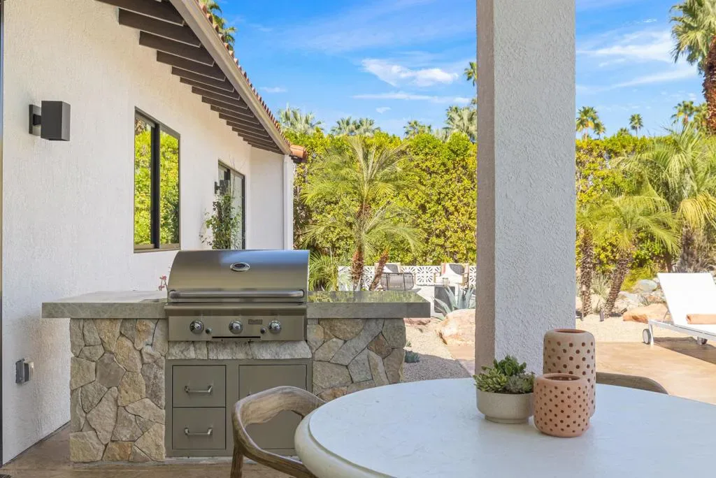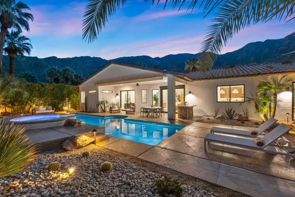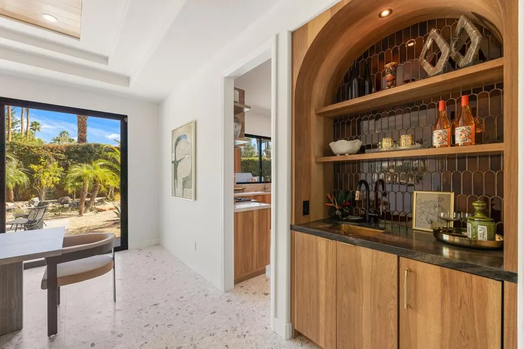 Set on Rose Avenue in the iconic Vista Las Palmas neighborhood, surrounded by celebrated period mid-century homes and framed by dramatic mountain views, this residence offers a rare combination of scale, flow, and modern infrastructure. Built in 2001 and now extensively reimagined in a sophisticated Spanish-modern, mid-century vernacular, the home blends architectural presence with contemporary comfort. Expansive living spaces with 12-foot ceilings are unified by dramatic large-format terrazzo tile flooring and illuminated by new Monumental metal windows and slidingdoors that flood the interior with natural light while connecting seamlessly to mature desert landscaping. The fully re-envisioned kitchen features custom hickory-pecan millwork, designer tile from Spain, honed Taj Mahal counters, and new high-end appliances from Monogram. The flow continues into the adjacent family room with a custom floating AV cabinet inspired by Broyhill’s iconic Brasilia line, and designer wallpaper. The living and dining areas are anchored by a striking two-sided fireplace with a floating hearth, wood-paneled ceilings, and a refined wet bar with leathered Sandalus quartzite and a Brizo fixture. A spacious laundry room provides additional storage and convenience.The generous primary suite opens directly to the backyard and features a large custom walk-in closet and a spa-inspired bath with double shower, Japanese soaking tub, dual vanities, linen storage, and a private water closet with bidet. Guest bedrooms include custom wallpaper, large picture windows oriented toward the dramatic San Jacinto Mountains, and striking Elizabeth Sutton terrazzo mosaic tile in the baths. The chic powder room features a floating vanity and a mid-century-inspired tile wall. Outside, new stonework enhances the exterior and BBQ island, while the refreshed pool with new tile, lush landscaping, natural koi pond, new patio with fire pit, and a custom Trina Turk-designed breeze-block wall create a true desert retreat. Modern infrastructure includes new plumbing fixtures, designer lighting throughout, app-based systems including Pentair pool controls and a whole-house alarm with 8-camera security system, three car garage, plus owned solar panels, and two PowerWall backup batteries which supply continuous power in the event of an electrical outage, and provide for lower energy costs by powering the home during the evening hours. A rare opportunity in one of Palm Springs’ most prized neighborhoods.