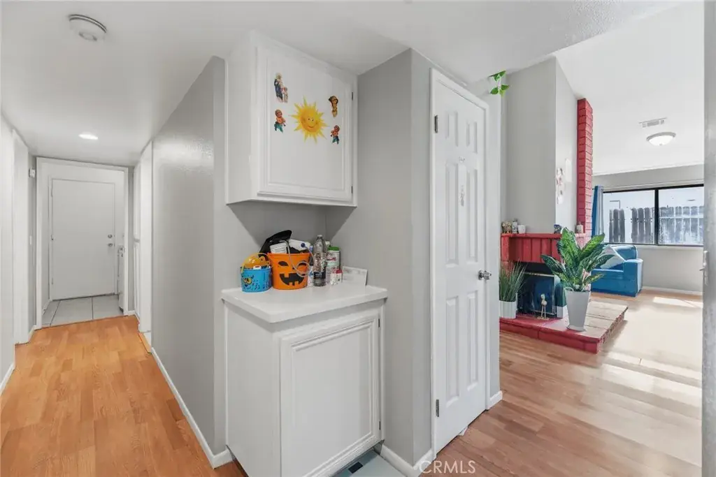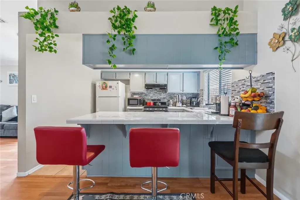 Hardwood-style flooring runs through the main living areas and all three bedrooms, creating a cohesive, warm feel throughout. The kitchen features updated slate-blue cabinetry, a decorative tile mosaic backsplash, a gas range, and tile flooring functional and thoughtfully finished. A dedicated indoor laundry room with built-in shelving keeps daily living organized and efficient.