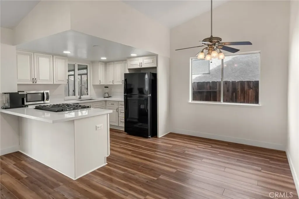 Welcome to this beautifully upgraded single-story home! This beauty offers 4 bedrooms and 2 full bathrooms, thoughtfully updated from floor to ceiling. Step through the new front door into a bright and spacious open floor plan featuring vaulted ceilings and a gorgeous fireplace that anchors the inviting family room. Flooring flows through the primary bedroom and main living areas. The stunning kitchen is sure to impress with quartz countertops, new antique white cabinetry, a single-bowl stainless steel under-mount sink, and a unique faucet that lights up when the water is turned on. High-quality sinks and faucets, along with newer toilets. Enjoy extra living space in the 250 sq. ft. enclosed sunroom, perfect for relaxing or entertaining.