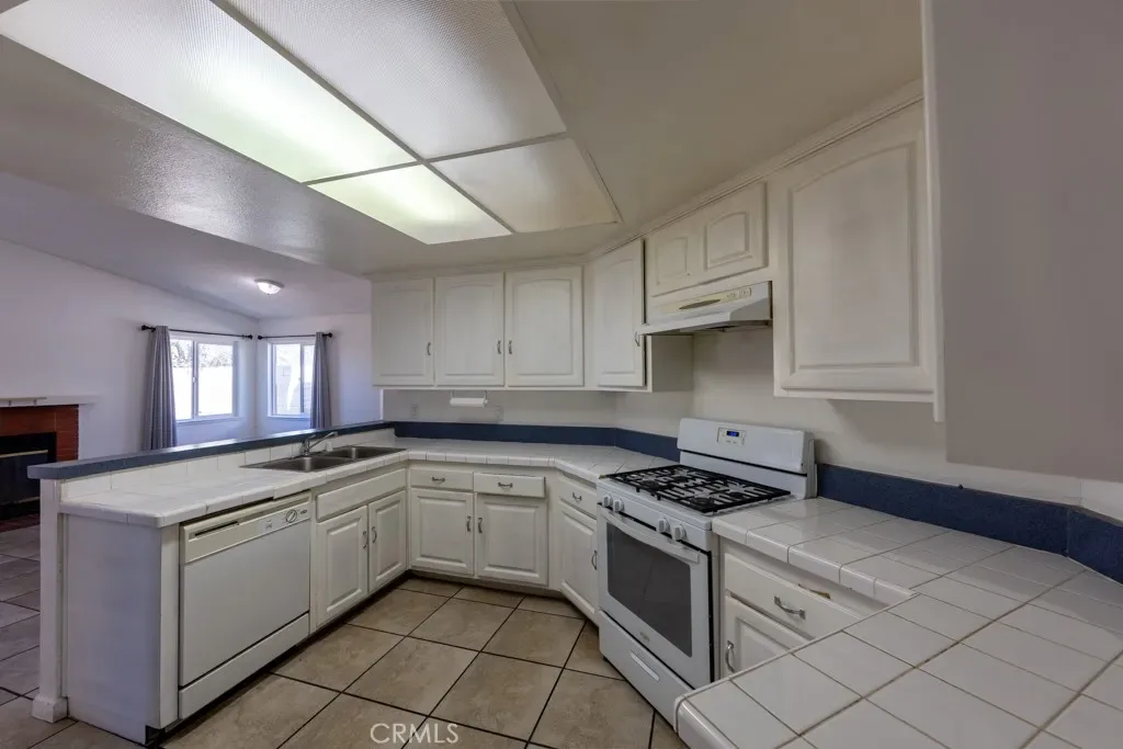 Charming 3-bedroom, 2-bathroom home with tile flooring throughout the main living areas, including the kitchen, dining room, and living room. The living room features a cozy fireplace and two sliding glass doors that open to a covered back patio, perfect for relaxing or entertaining guests.