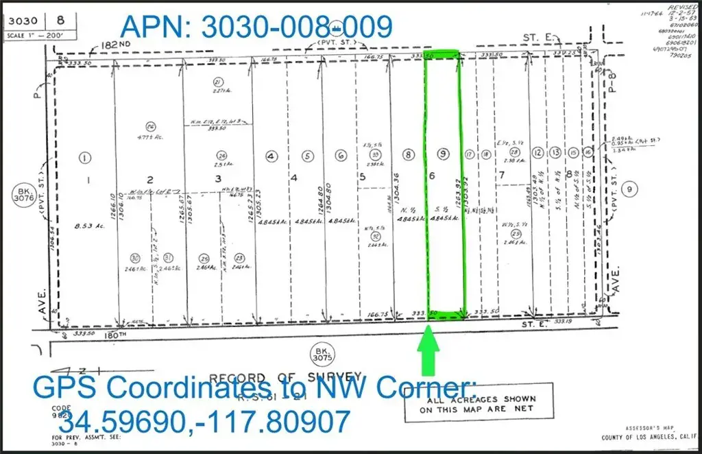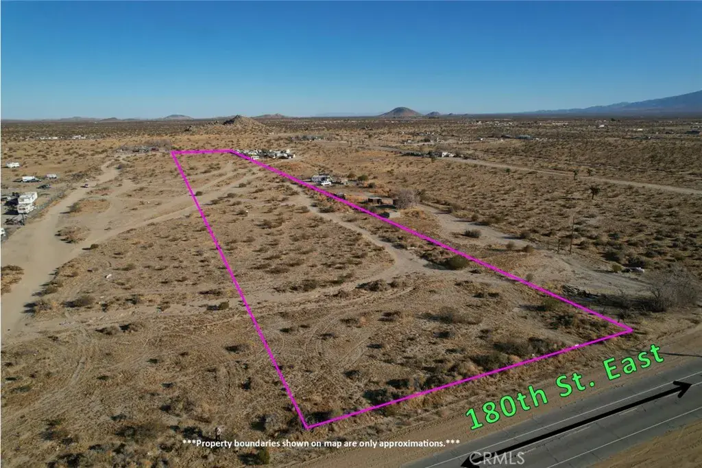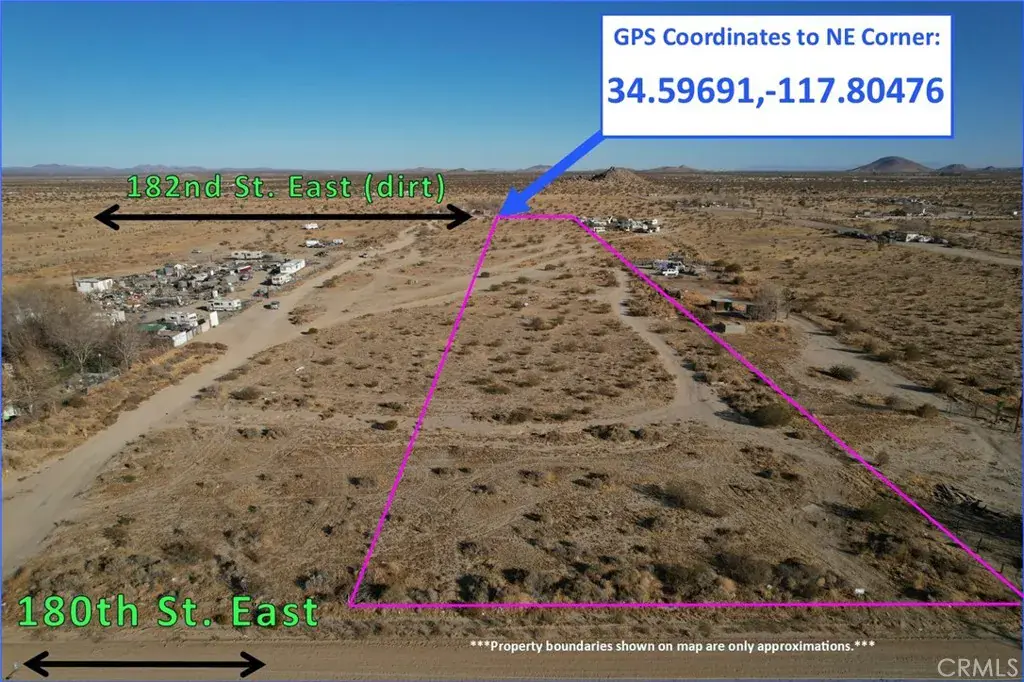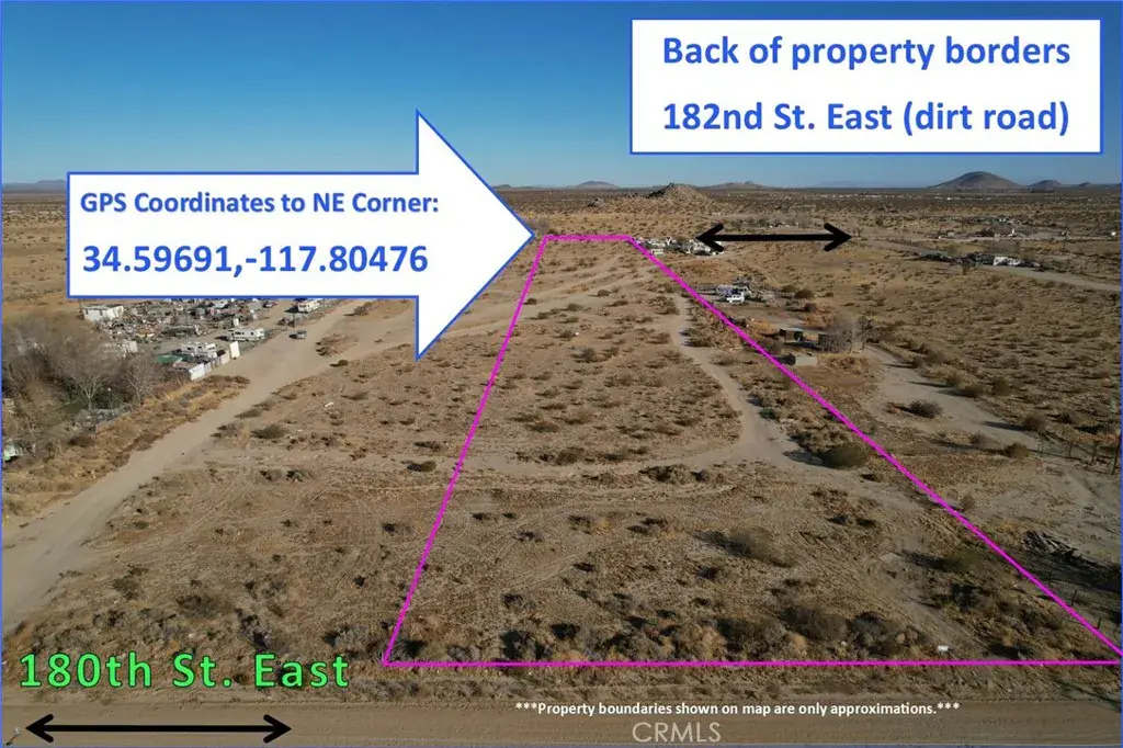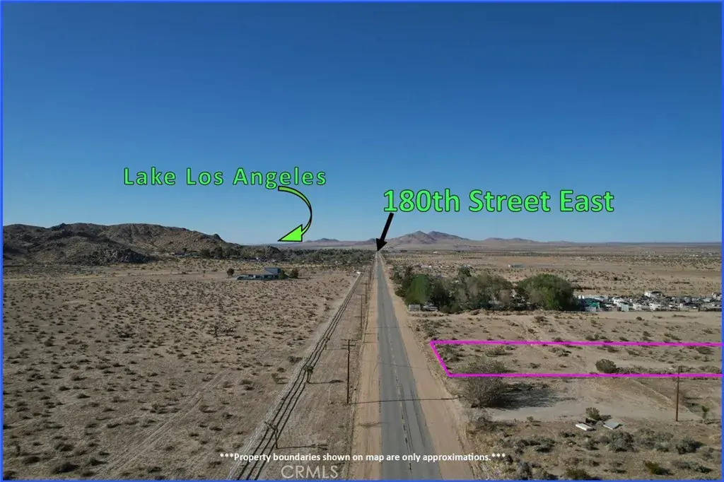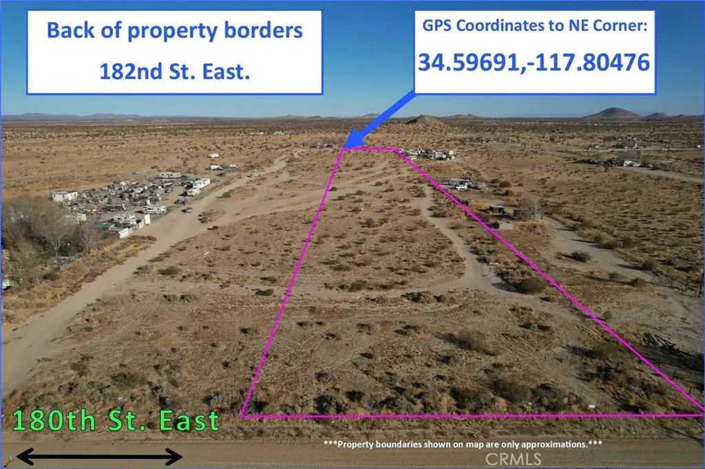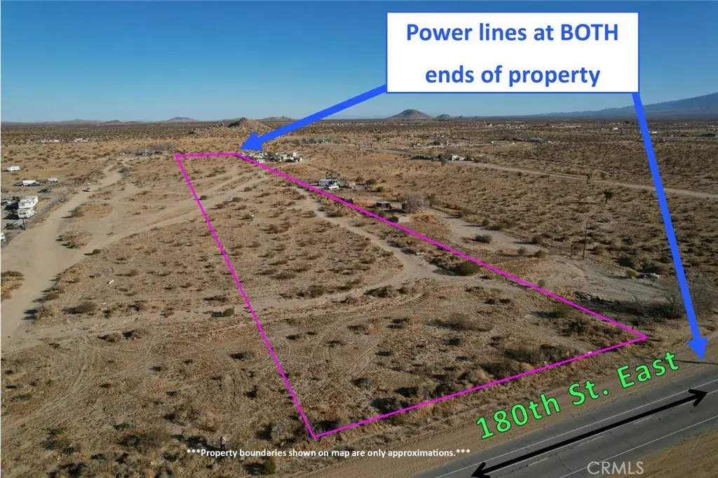 4.95 Acres (APN: 3030-008-009) GPS: 34.5969, -117.80908 According to the Los Angeles County the property [ ZONING ] A-1-2 Light Agriculture. Single family residences, crops, greenhouses, raising of cattle (horses, sheep, goats, poultry) are permitted uses in the area. [ POWER ] Overhead Powerlines run along 180th St E. (west property line) [ WATER ] Water is provided by the LA County WWD 40-35 district. Residents in the area have septic tanks for their sewer needs, no septic installed. [ PAVED ROAD FRONTAGE ] Property fronts 180th St E which his PAVED, and also has rear access to the back of the property via 182 St E which is a dirt road.