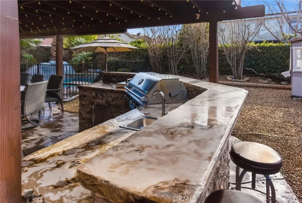 The front, back and side yards have water saving dry-scaping. The perimeter of the property has meticulously landscaped grounds with many mature pomegranate trees, a lemon free, lilac bush, and many palm trees and mature rose bushes. It has a custom extra-large covered patio. A unique addition is the large playhouse—capable of accommodating around eight adults—that will remain with the home.Located minutes from Maria Kerr Park, the Palmdale Softball Complex, the prestigious Rancho Vista Golf Club, and the Antelope Valley Mall, everything you need is right at your fingertips