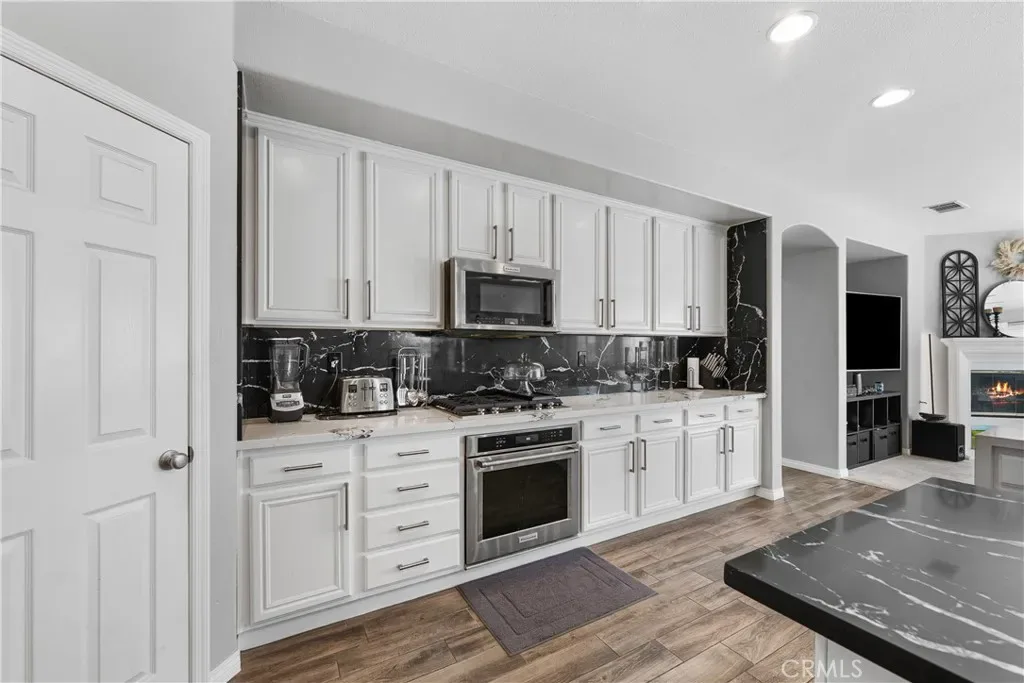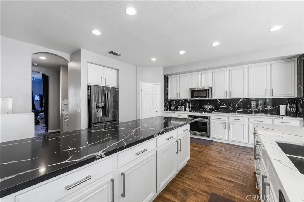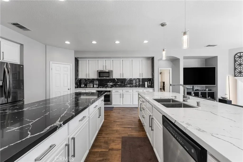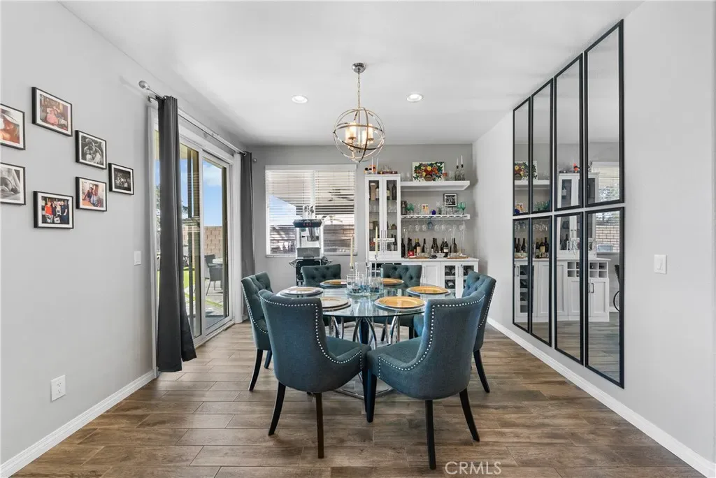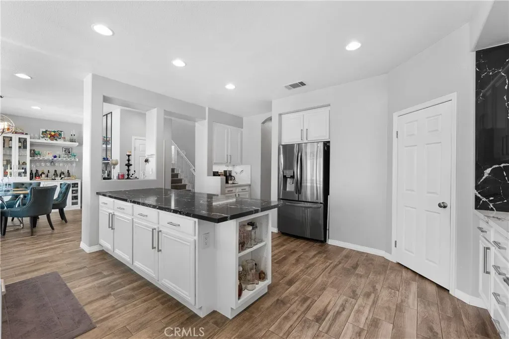 The main floor also features a full bedroom and a full bathroom, along with a convenient powder room—perfect for guests. The heart of the home is the open-concept chef’s kitchen, dining, and family room, featuring double islands with upgraded quartz countertops, a walk-in pantry, and a coffee/buffet station. This seamless layout flows directly to the backyard, creating a perfect indoor-outdoor entertaining experience.