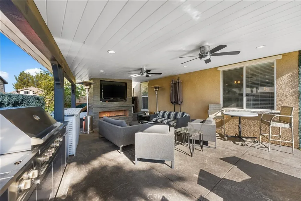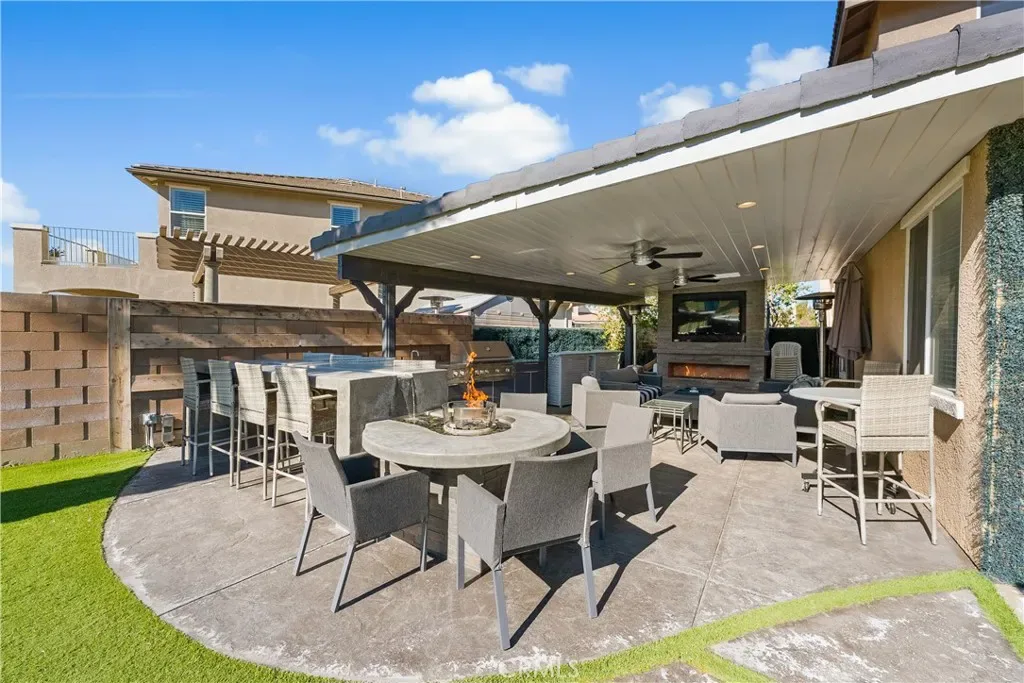 Step outside to a backyard oasis designed for year-round enjoyment. The resort-style pool with a waterslide, spa, fire pit, outdoor fireplace, and barbecue area all converge around two covered spaces: one a cozy lounge, the other a movie or TV area—perfect for relaxing or entertaining. A stunning fire and water feature, along with low-maintenance turf, completes this dream backyard.