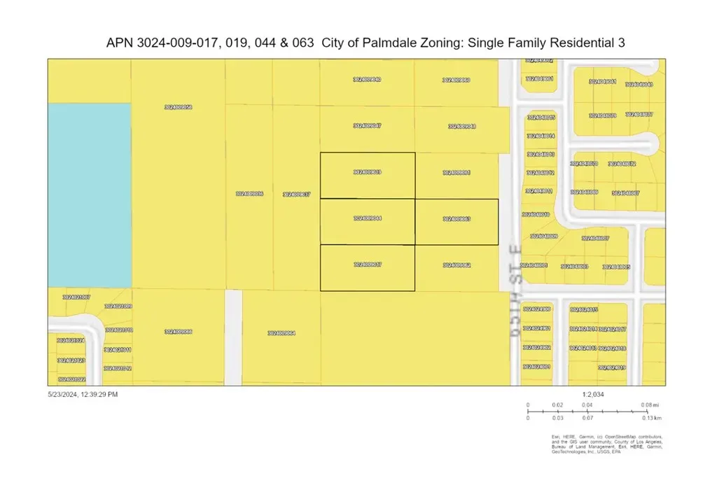 A builder’s bundle! Four contiguous parcels totaling just under 5 acres in a prime East Palmdale location within walking distance of schools and park. Paved street frontage with water and electricity along 65th Street, sewer in the street at Ave R-4, and nice existing homes all around. A great opportunity with the potential to build one home, four homes – or subdivide for more! Zoned Single-Family Residential 3 (SFR 3), intended for detached single-family subdivisions containing the City’s standard 7,000 square foot minimum lot size (at a maximum of six dwelling units per acre). Check with the City of Palmdale Planning Department for more information on possible uses for these parcels. Includes APNs 3024-009-017, 3024-009-019, 3024-009-044 and 3024-009-063. Package priced for a cash sale. Fantastic potential in a great location! *Buyer to make their own independent investigations regarding Zoning & General Plan Designations, Environmental & Hazard Zones, Access & Development Costs, Availability & Costs of Utilities.