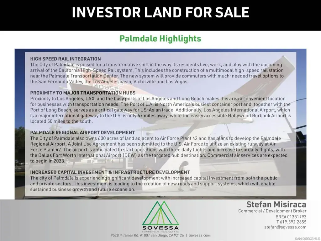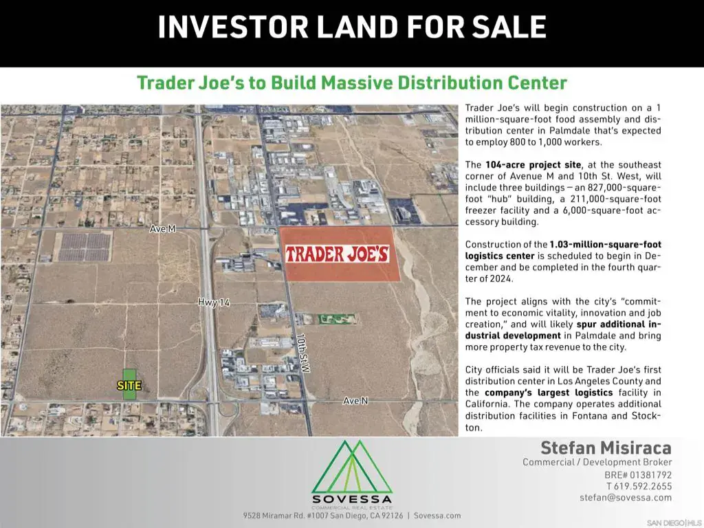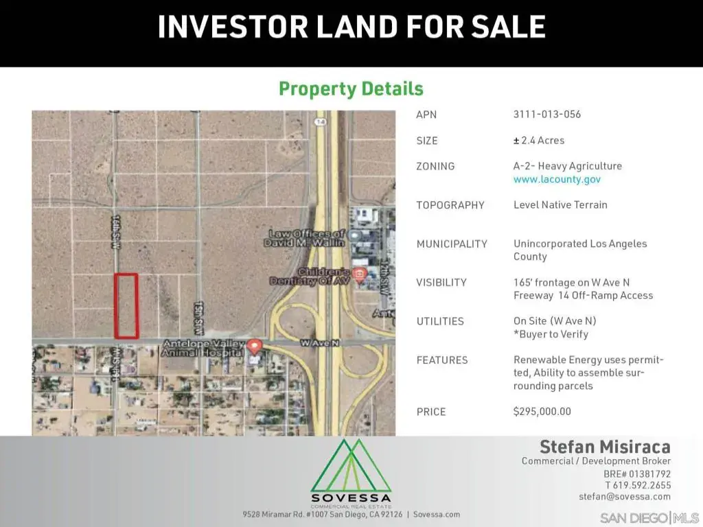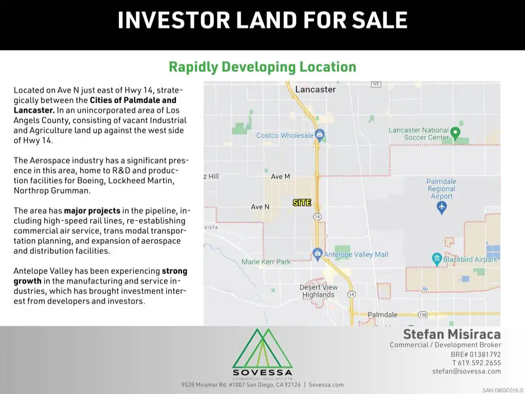 An Opportunity to acquire 2.4 Acres of Freeway off-ramp accessible land. One parcel fronting W Avenue N with all utilities in place surrounded by major commercial points of interest. The Antelope Valley remains a desirable Investment market with major projects underway, including a 1 million-square-foot distribution center across the Hwy and high speed rail station in the city of Palmdale.