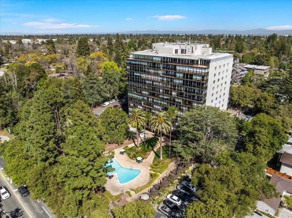 Enjoy the view, amenities (including gym, library, community rooms, pool and more) and the stellar location living in this landmark building. Large open living/dining and viewing area between the bed/bath suites. One suite has walk-through closet plus wall of custom cabinets for office or hobby storage. Capitaviting views from the 10th floor! World-class enducational, medical, retail shopping (Standford Shopping Center) and gourmet dining are at every turn. Public transportation services, inlcuding Caltrain (just across the street) and two International airports are about 35 miles close. Seize the good life in this spacious condo.