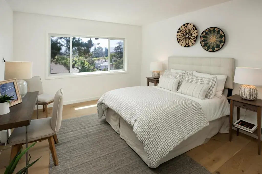 Exceptionally rare mid-century residence in Downtown Palo Alto located in Everett House. This expansive 1,762 square foot home offers an open floor plan with windows on three sides creating abundant natural light and exceptional privacy. Residence 5B features only one limited shared wall confined to closets and baths and no units above the living space resulting in remarkable quiet. The only unit in the building with unobstructed sunset views reaching Stanford campus and the hills beyond. Living room features floor to ceiling windows and opens to a large wraparound deck. Home has been completely remodeled with a designer’s eye. Open kitchen includes white marble counters with peninsula seating custom cabinetry and built in shelving with adjacent dining area. Two large bedrooms plus a versatile bonus room ideal for office nursery or gym. Baths feature Thassos marble with walk in shower and tub. Building boast large grounds, dramatic oversized lobby, large swimming pool, cabana. A refined home with timeless architectural character and rare privacy OWNERS PAY NO UTILITIES- including, gas water, electric- ALL INCLUDED IN HOA .