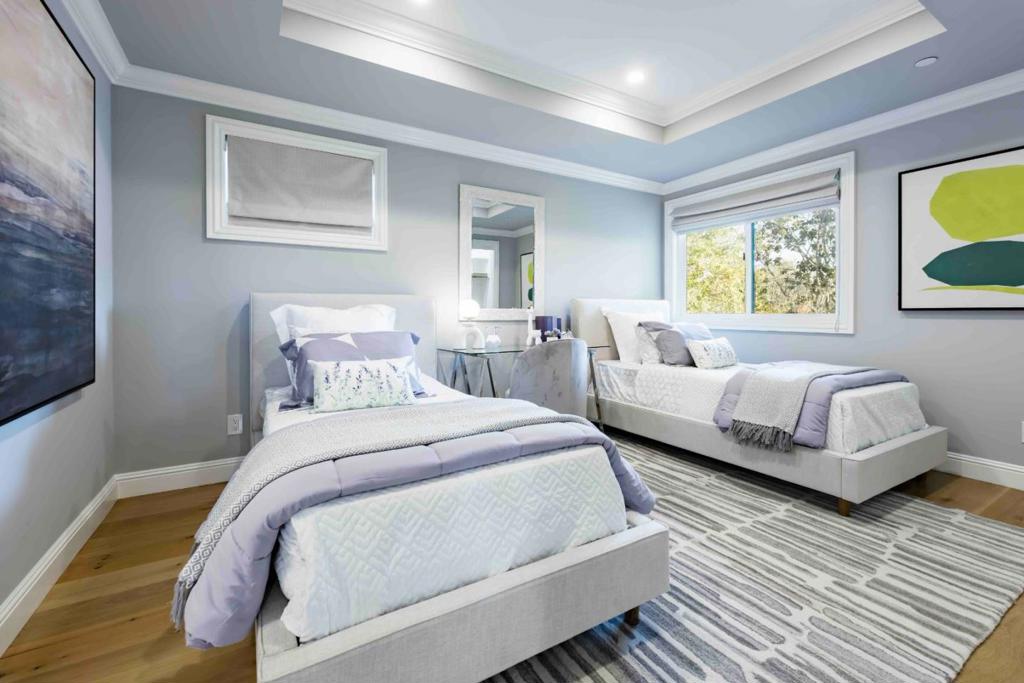 Graceful Mediterranean architecture and refined modern interiors define this beautifully crafted home, where clay barrel roof tiles and a stately arched entry create enduring curb appeal. Spanning more than 2,800 square feet across two levels, the home blends timeless character with contemporary design. Wide plank white oak floors, detailed ceilings, and elegant lighting create a luxe ambiance throughout. The living room features a curved window wall that fills the space with natural light and flows to the dining room and a stunning kitchen with a Thermador appliance suite. The adjoining family room centers around a fireplace set against a textured accent wall. Five bedrooms include a serene primary suite with private balcony and spa inspired bath, plus a guest suite and flexible main level bedroom. The peaceful backyard is ideal for entertaining. Close to Mitchell Park, Cubberley Community Center, Charleston Plaza, and top schools Fairmeadow, JLS, and Gunn (buyer verify eligibility).