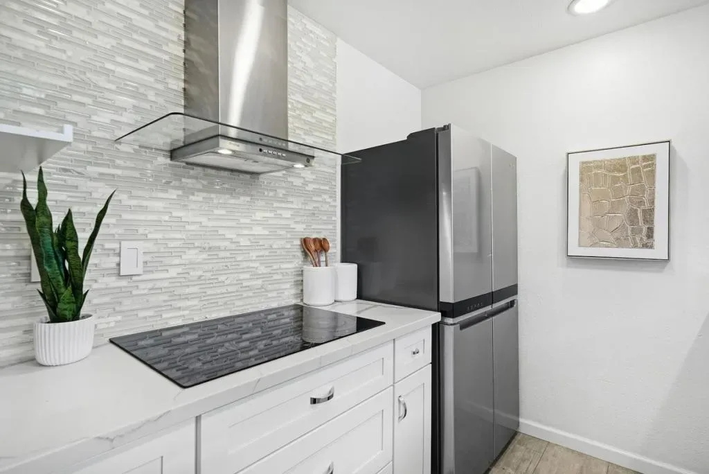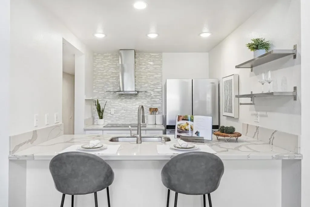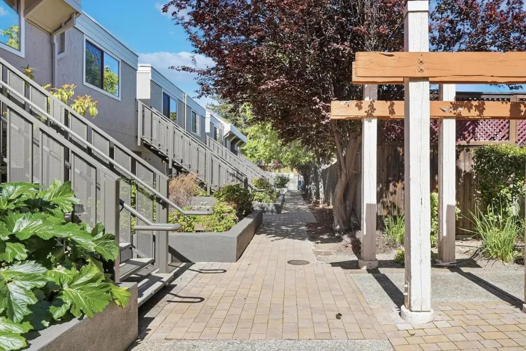 Welcome to this prime end-unit condo with 2 beds and 2 baths in the heart of Palo Alto, set within a gated community. This two-story home offers a thoughtful layout, starting with a spacious lower-level bedroom and a nearby full bath featuring a floating vanity and a sleek stall shower. Down the hall, the cozy kitchen includes quartz countertops, a stylish backsplash, stainless steel appliances, and a breakfast bar. The bright living room boasts a vaulted ceiling and large windows, filling the space with natural light. A sliding door opens to a private balcony-perfect for relaxing outdoors. Upstairs, the primary suite features a bedroom with a vaulted ceiling and an en-suite bath with a shower over tub and skylight, plus direct access to an upper-level balcony. A washer and dryer on the same level add everyday convenience. Additional highlights include engineered hardwood flooring, double-pane windows, and recessed lighting throughout. The home comes with two assigned parking spaces and extra storage in an underground garage. Ideally located near downtown, shops, and restaurants, and within the top-rated Palo Alto school district. Do not miss this great opportunity!