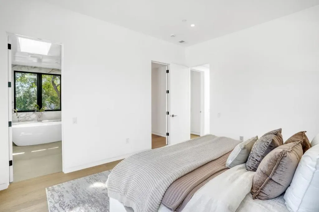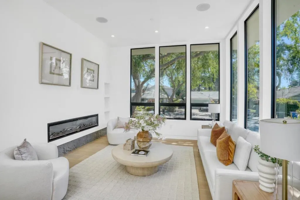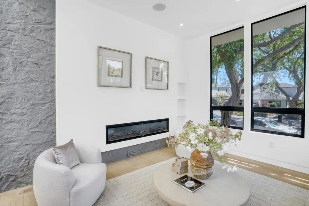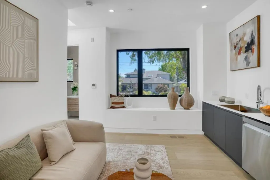 Modern new construction in desirable Midtown Palo Alto, offering approximately 3,440 sq ft of refined living space on a 7,387 sq ft lot, including an attached JADU. Designed with an emphasis on natural light and clean architectural lines, the home features European wide-plank white oak flooring, skylights, and Marvin windows throughout. The open-concept great room flows seamlessly into the backyard through an oversized multi-panel sliding glass door for effortless indooroutdoor living. A custom slatted-wood staircase adds warmth and architectural interest. The chefs kitchen showcases Arrital (Italy) cabinetry with integrated panels, organized storage, and a premium Miele appliance suite: 8-burner cooktop, integrated refrigerator, wine cooler, and speed oven. A stone island, pot filler and full-height slab backsplash complete the space. The primary suite offers high ceilings and a serene ambiance, complemented by a spa-inspired bath with a soaking tub, curbless shower, radiant heated floors, double-sink vanity, smart toilet, and fixtures by Rohl. An attached JADU offers flexibility for guests or workspace. The backyard extends outdoor living, while an attached garage and driveway provide convenient parking.