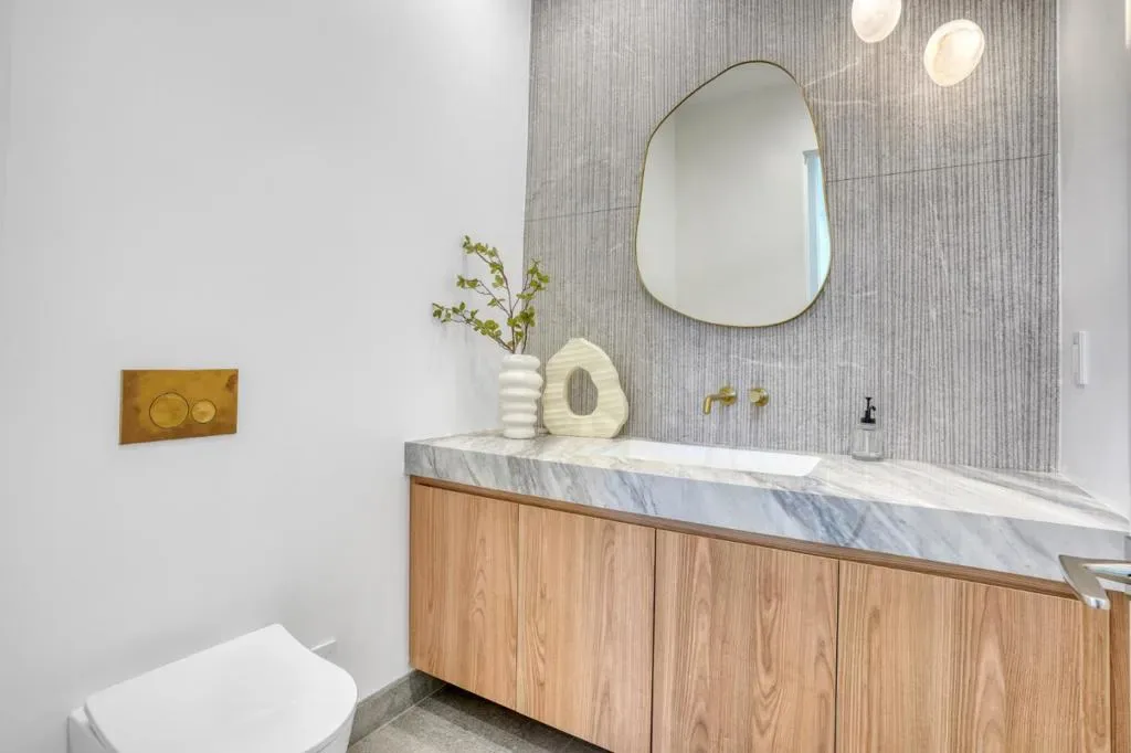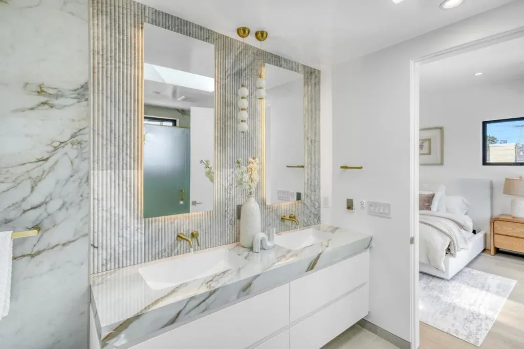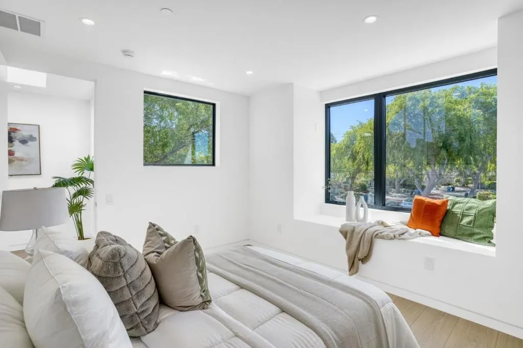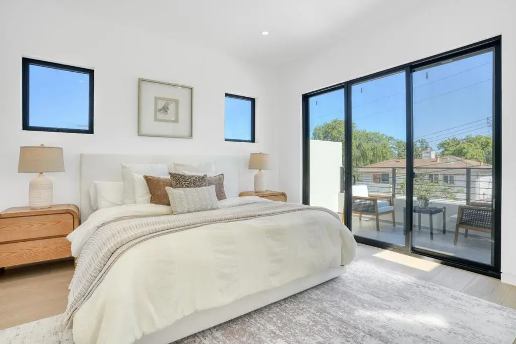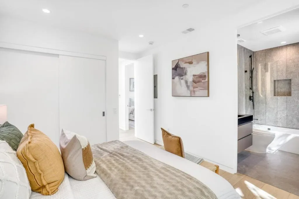 Modern new construction in desirable Midtown Palo Alto, offering approximately 3,440 sq ft of refined living space on a 7,387 sq ft lot, including an attached JADU. Designed with an emphasis on natural light and clean architectural lines, the home features European wide-plank white oak flooring, skylights, and Marvin windows throughout. The open-concept great room flows seamlessly into the backyard through an oversized multi-panel sliding glass door for effortless indooroutdoor living. A custom slatted-wood staircase adds warmth and architectural interest. The chefs kitchen showcases Arrital (Italy) cabinetry with integrated panels, organized storage, and a premium Miele appliance suite: 8-burner cooktop, integrated refrigerator, wine cooler, and speed oven. A stone island, pot filler and full-height slab backsplash complete the space. The primary suite offers high ceilings and a serene ambiance, complemented by a spa-inspired bath with a soaking tub, curbless shower, radiant heated floors, double-sink vanity, smart toilet, and fixtures by Rohl. An attached JADU offers flexibility for guests or workspace. The backyard extends outdoor living, while an attached garage and driveway provide convenient parking.