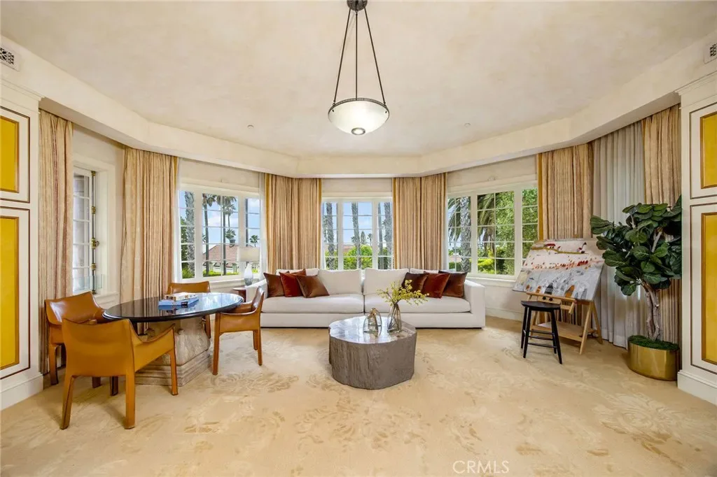 Along with a rec room with sunken bar, lounge area and adjacent movie theater room are basement-level luxuries including a two-lane bowling alley, dojo, gym and sophisticated nightclub with bar seating and sound-equipped DJ booth. An orchestra mezzanine, beauty salon, private telephone booth, coat closet, housekeeper’s area, and house manager’s office, plus two elevators and an eight-car garage round out the amenities.