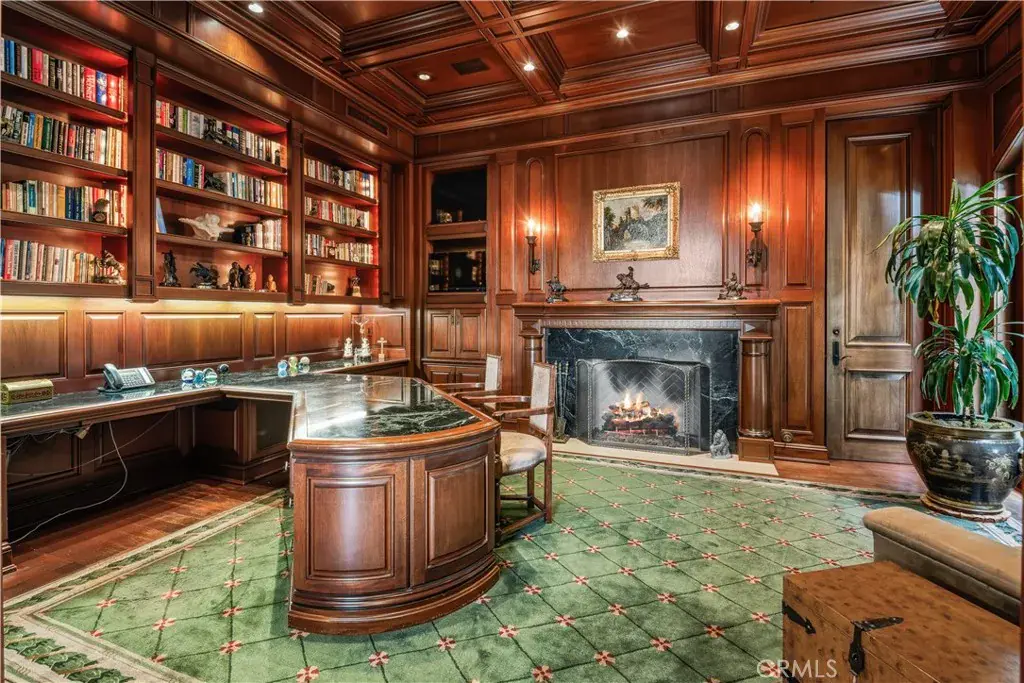Reminiscent of a classic Beverly Hills estate, this custom designed home was built to embody timeless elegance and enduring quality. A magnificent two-story entry opens to a grand living room with fireplace, while the adjacent library impresses with rich wood paneling, a marble fireplace, and architectural detail.