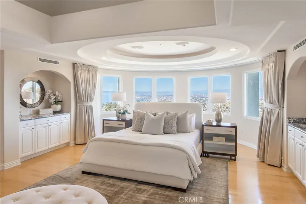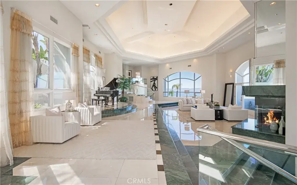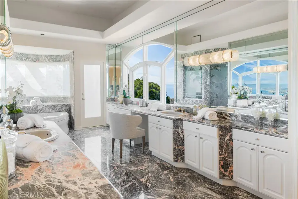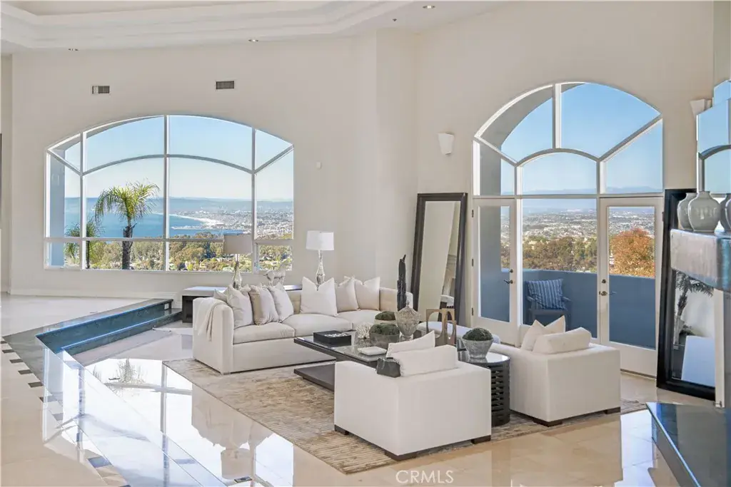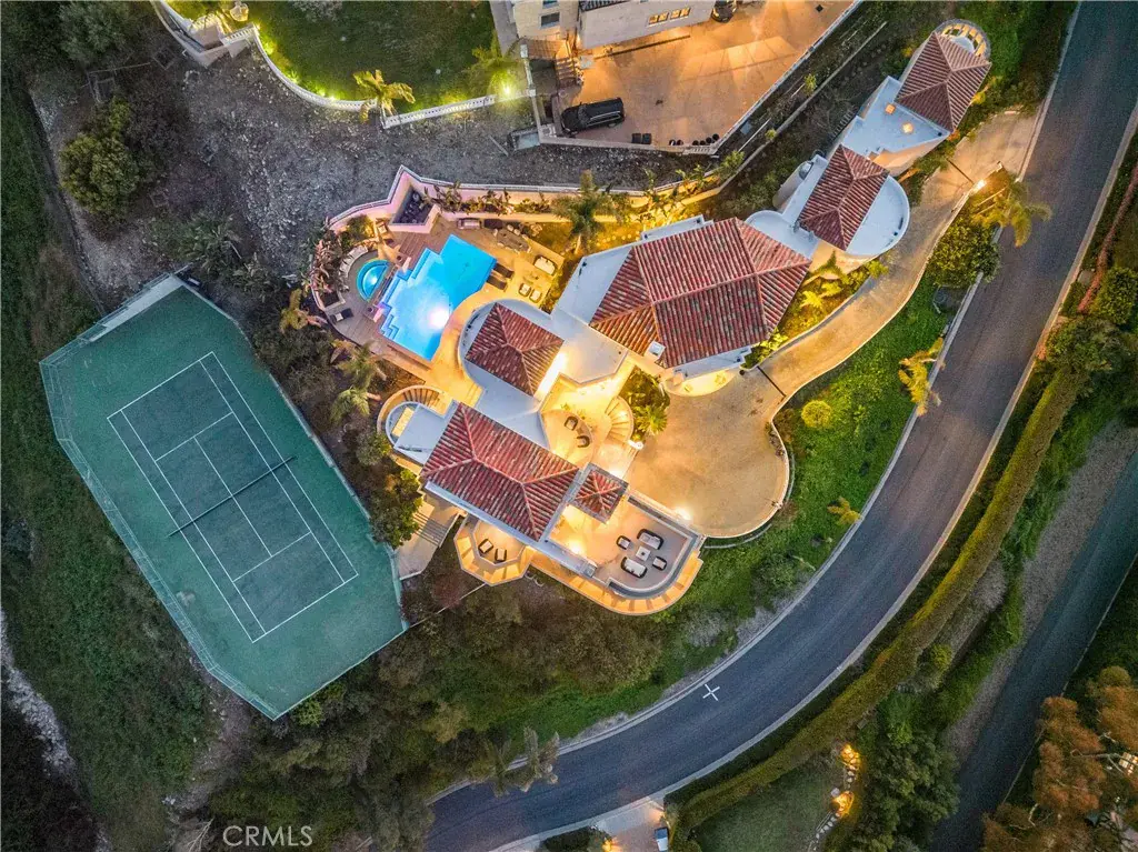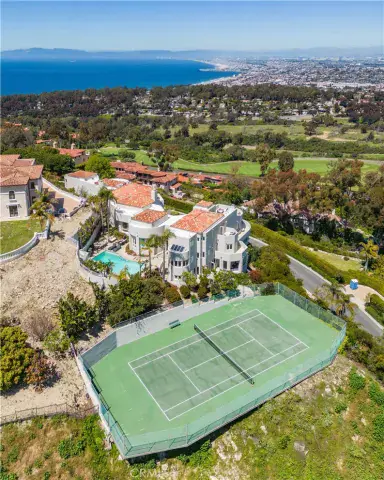 SWEEPING QUEEN’S NECKLACE VIEW, TENNIS COURT ESTATE- Perched atop a serene cul-de-sac in the esteemed enclave of Palos Verdes Estates, this exceptional gated estate offers a rare fusion of luxury, privacy, and unmatched vistas. From its commanding vantage point, this residence presents the stunning Queen’s Necklace view and overlooks the verdant fairways of the Palos Verdes Golf Course. Upon entering through the private gates and ascending the driveway, you’re welcomed into a realm of sophistication. Step inside the expansive interior, where vaulted ceilings and walls of large glass windows accentuate the breathtaking view. The immense living room and formal dining area create an ideal setting for formal entertaining, with seamless access to multiple decks and balconies for the mesmerizing coastal panorama. At the heart of the home lies the contemporary kitchen and adjacent family dining room, perfect for family gathering in the sweeping vistas. A circular designed wet bar by the family room provides additional spaces for entertainment. A luxurious primary suite offers a sitting area with a fireplace and breathtaking view. A spacious office/ library provide the comfort for inspiration and contemplation. Retreat to the lower level, where a home media center and game table await, providing endless opportunities for leisure and recreation. Outside, the property boasts a pool, spa, waterfall, and a north–south facing tennis court. Expansive decks and balconies afford ample space for lounging and appreciating the beauty of the surroundings. An aesthetic balance of comfort and design permeates every room of this house. With its unparalleled blend of lavish amenities and breathtaking views, this private estate offers a lifestyle of refinement and tranquility, epitomizing coastal luxury living. A rare opportunity!