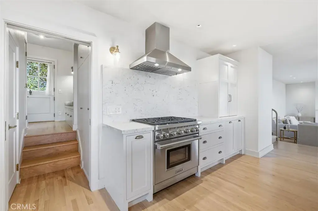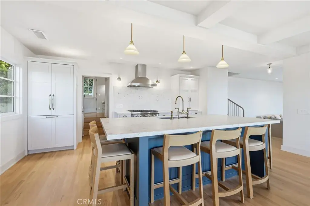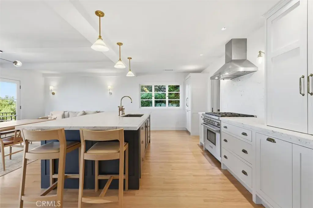 The home features a thoughtfully designed open floor plan with stunning views from most rooms, complemented by custom cabinetry throughout that adds both beauty and functionality. The gourmet kitchen is a showpiece, featuring an oversized center island with white marble countertops and seating for six, top-of-the-line appliances including a Wolf 6-burner range and oven, Dacor refrigerator and freezer, Bosch dishwasher, hand-forged brass fixtures, and oak hardwood floors.
